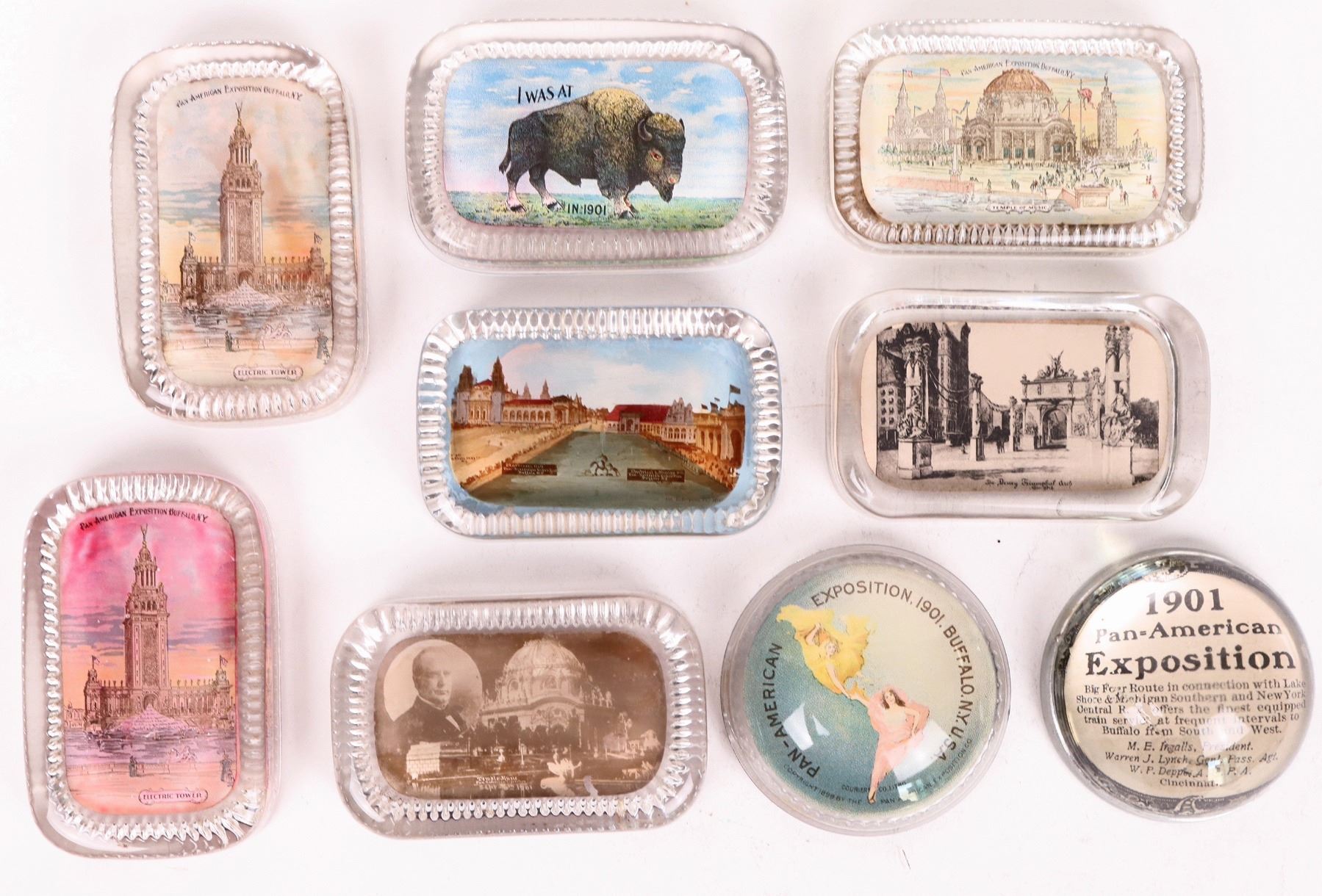 Nine glass paperweights from the 1901 Pan American Exposition held in Buffalo New York. Two are circular, seven are rectangular (4 x 3 inches): Temple of Music (2) , North and South America, I Was At Buffalo in 1901; Big Four Route: Lake Shore and Michigan Southern and New York Central Railroad; Electric Tower (2); Dewey Triumphant Arch; Machinery Hall. The Exposition ran from May 1 through November 2, 1901 and drew more than 8,000,000 visitors. Often referred to as "The Rainbow City," it received international attention. It is remembered for being the location of the assassination of President William McKinley on September 6.