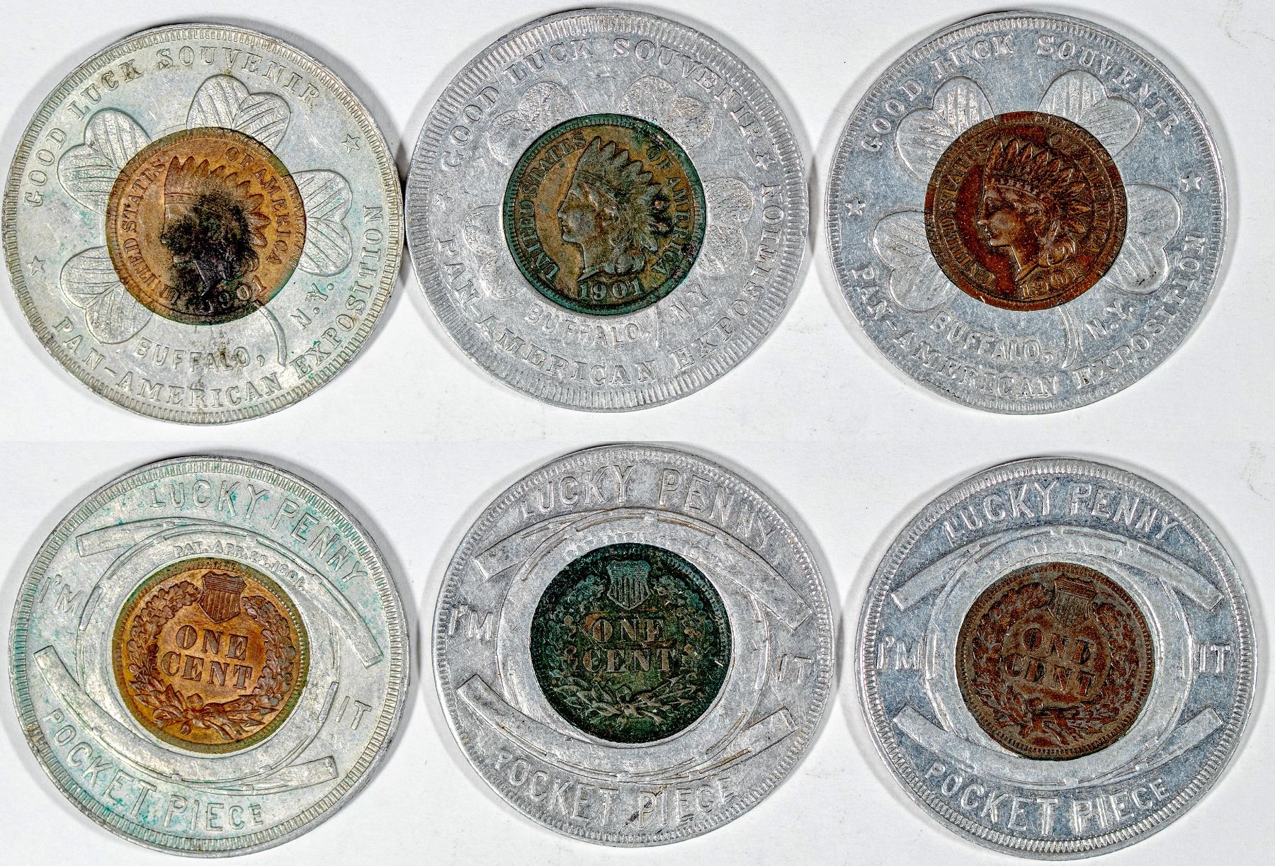 Lot of three 1901 Indian head pennies issued as souvenirs at the Pan American Exposition World's Fair in Buffalo New York, 1901. All VF-EF condition, some black toning on one.