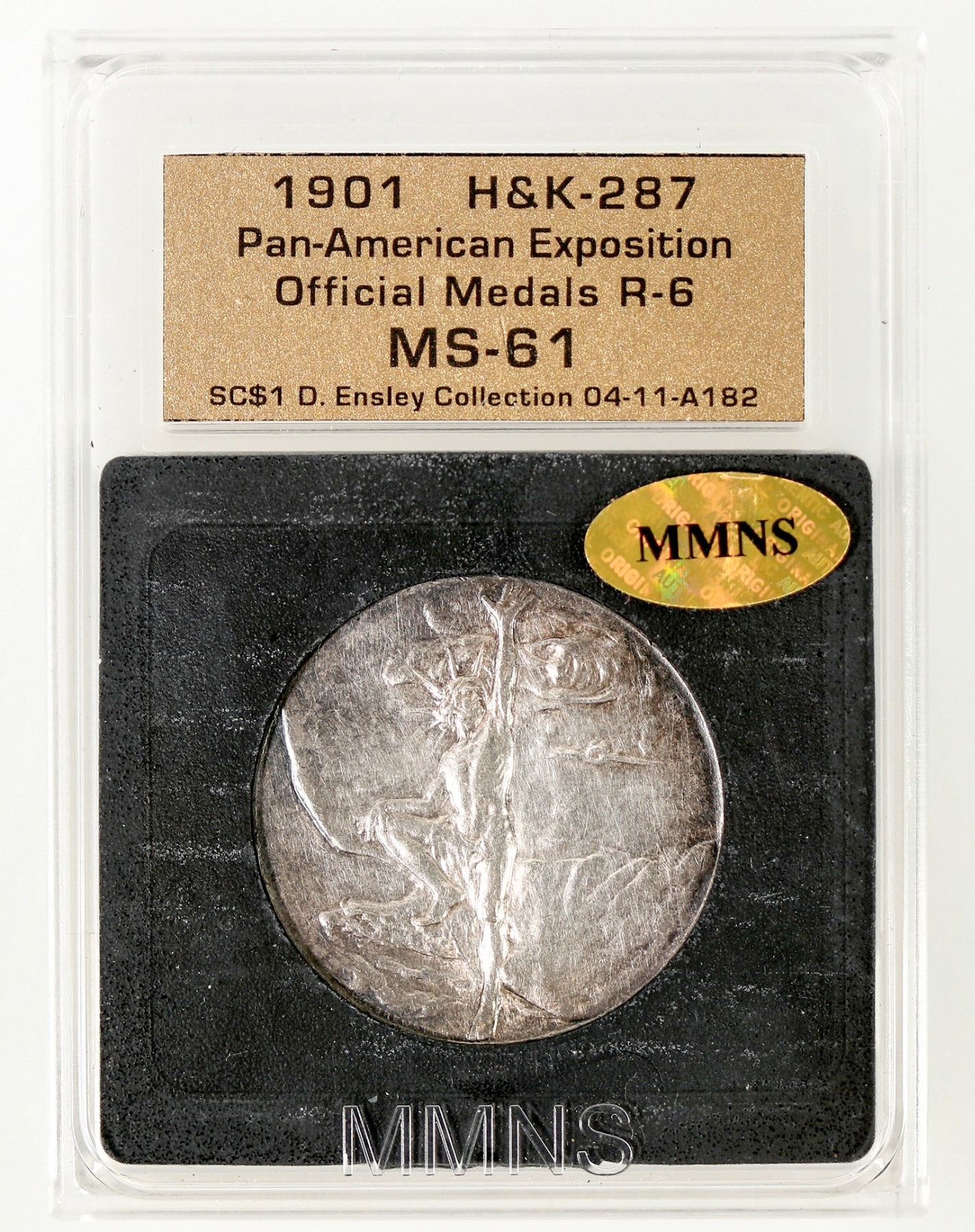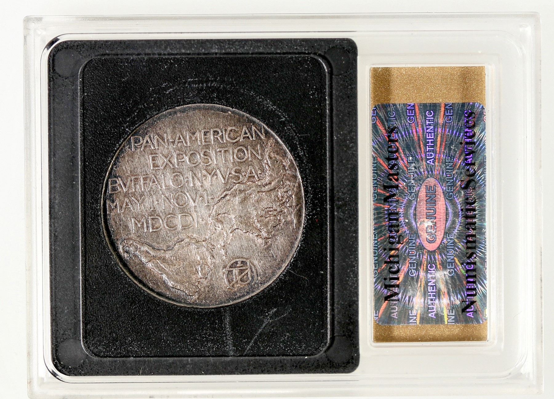 Obv. Standing heroic Indian figure, l. arm upraised, astride a soaring eagle; below to l., microscopic G. T. Brewster; Rev. Relief map of Western Hemisphere with monogram of the Exposition below; above map Pan ï American / Exposition / Buffalo ï N ï Y ï V ï S ï A ï / May 1 ï Nov 1 ï / MDCDI; Silver. 34mm.