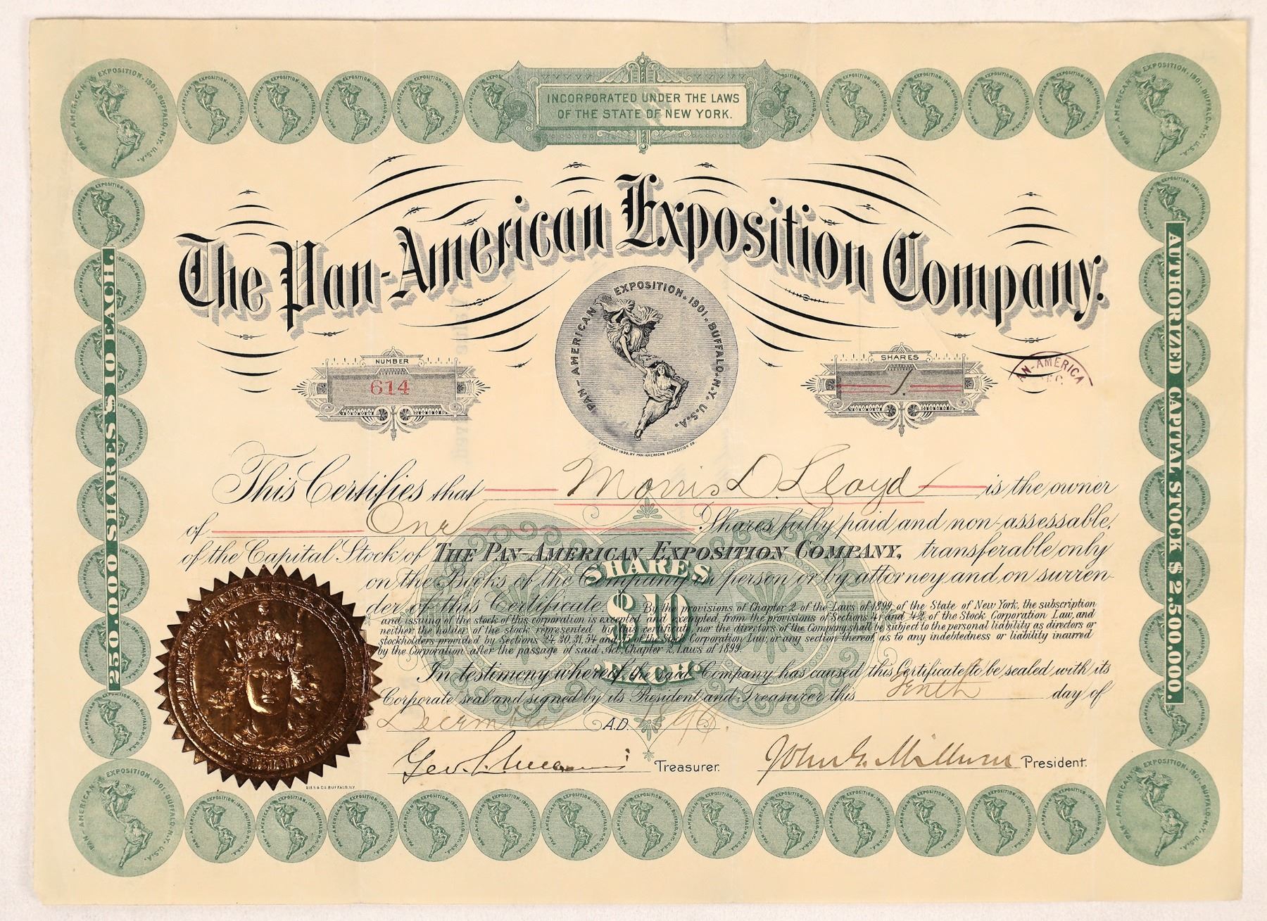 Beautiful certificate issued in 1899 for one share. Circular vignette of the official logo on the masthead, two allegorical figures from North and South America holding hands. Gold seal has the sun goddess. Circular rounds of the official logo encircle the entire certificate. Shares were $10 each, printed in fancy green underprint. The Pan-American Exposition was a World's Fair held in Buffalo, New York, United States, from May 1 through November 2, 1901. The fair occupied 350 acres (0.55 sq mi) of land on the western edge of what is now Delaware Park, extending from Delaware Avenue to Elmwood Avenue and northward to Great Arrow Avenue. It is remembered today primarily for being the location of the assassination of United States President William McKinley at the Temple of Music on September 6, 1901.