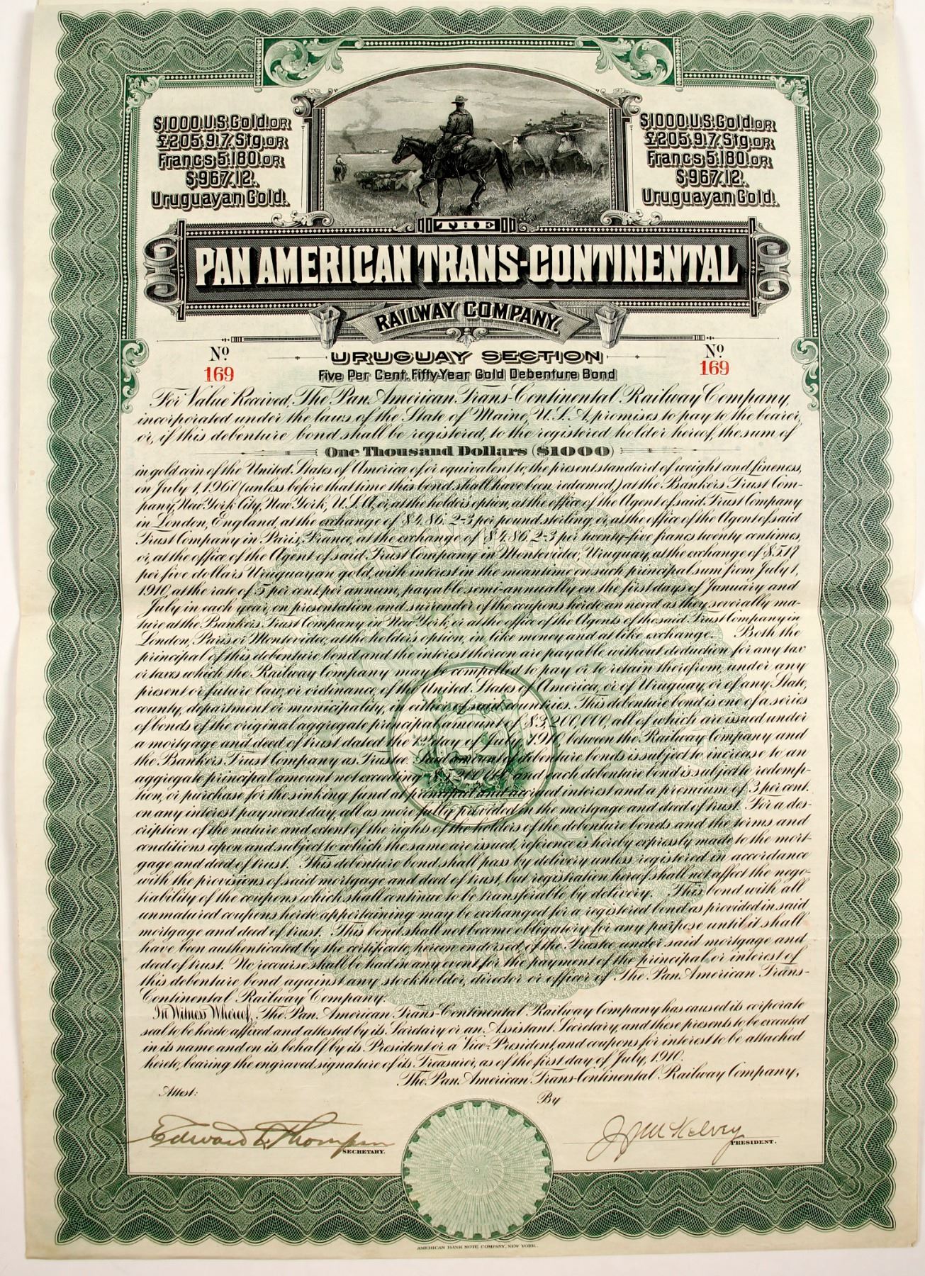 Rare#169 $1000 5% 50 year gold debenture bond signed by President Kelvey. Prag Collection State: City: Date: 1910 HWAC# 84215