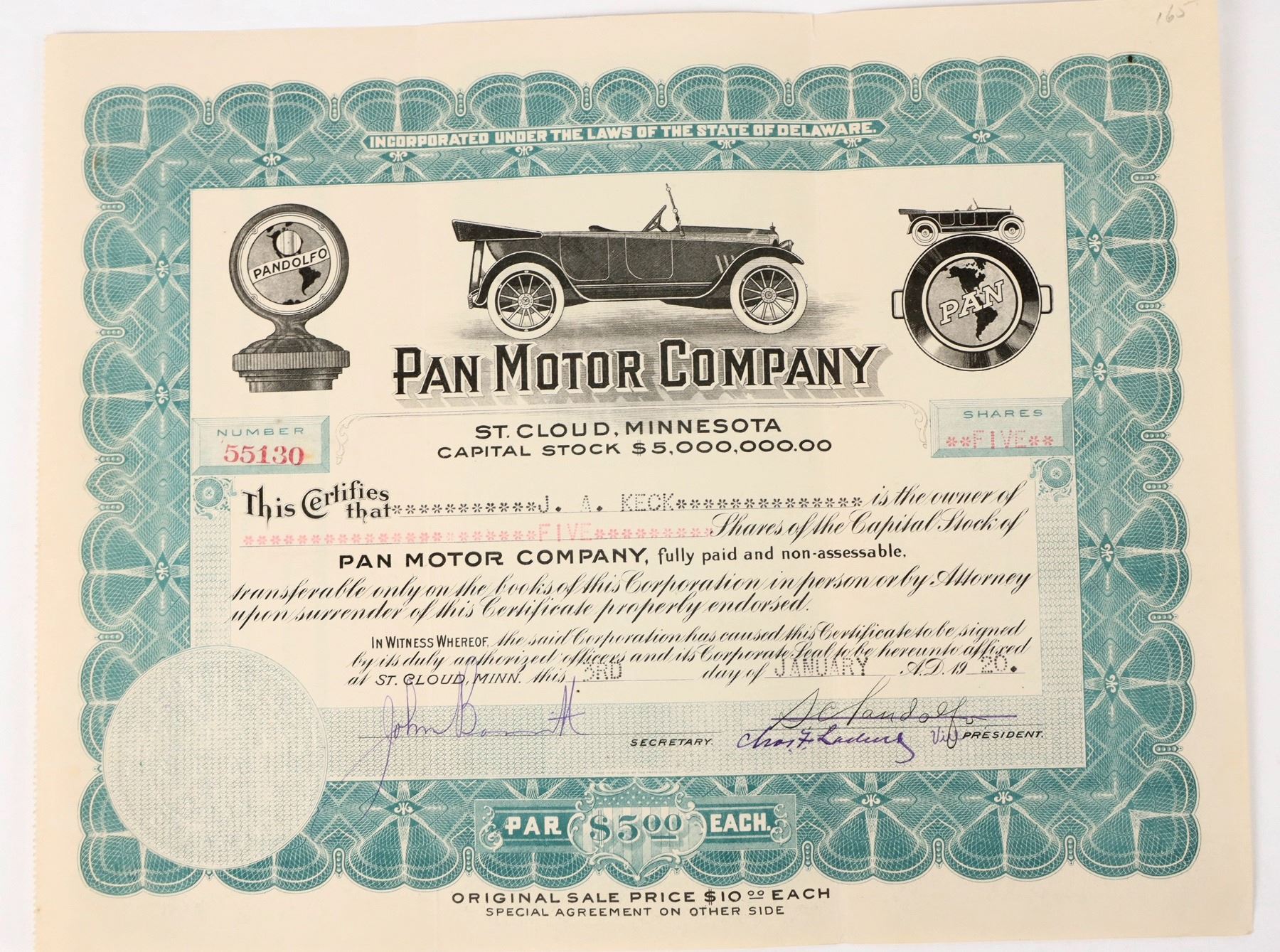 Inc. in Delaware. No. 55130, issued for 5 shares in 1920. Signed by SC Pandolfo as president and secretary John Bennett. Also signed by the vice president. Not cancelled. Green border, black print, and three vignettes: early car, plus two logos. Deep folds. Started in 1917 by Pandolfo, though there were problems from the start. The stock highlights this when it says shares are $5 each when Pandolfo was really charging $10, funneling money away from the capital fund. Pandolfo spent a ton of money advertising the company, while presenting preassembled cars and not producing any of their own. The factory in St. Cloud was completed in 1919. They produced the Pan Model A Touring Car, not preassembled, and the 1919 Pan Tourist Sleeper. However, eventually Pandolfo's mistakes caught up to him.