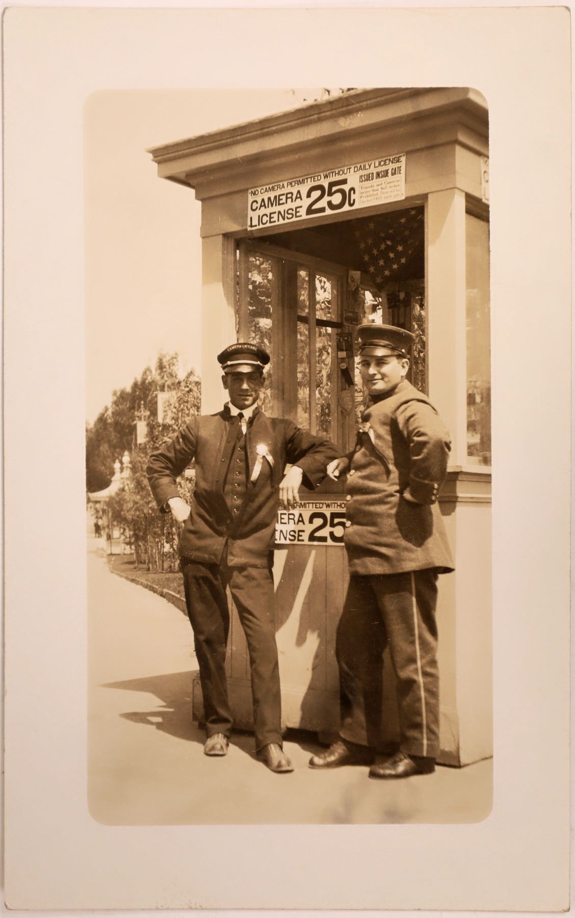 This is a rare RPC of the Pan-Pacific Expo. of 1915 showing the booth where you bought a "Camera Permit" to take photos. These two guys don't look that tough.