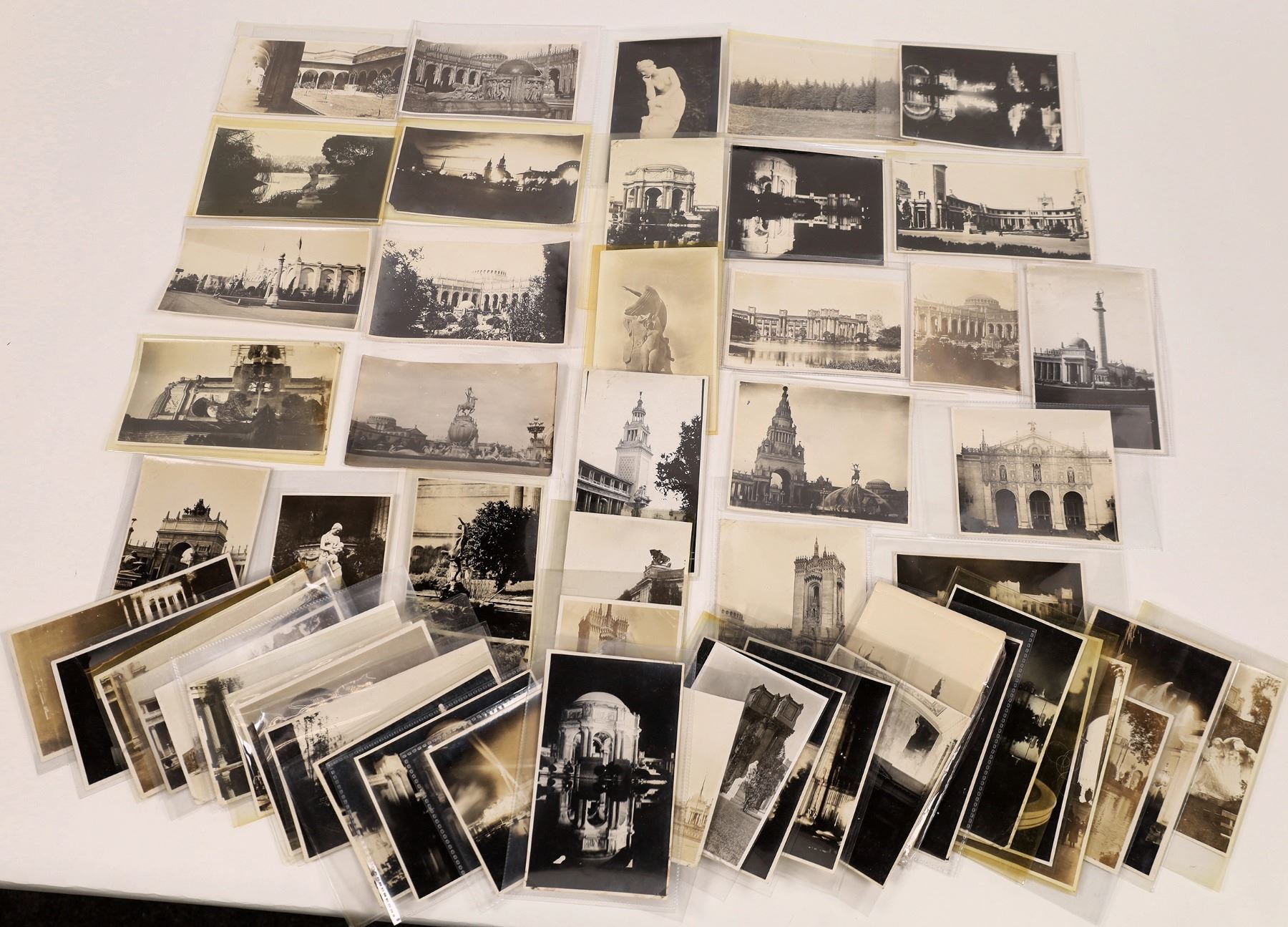 Sixty black & white photos of the Panama Pacific International Exposition of 1915. The bordered photos measure 3.3"x 6.5", with some a little smaller. While there were many international exhibits and buildings constructed for the event, the only one that is still recognizable, is the Palace of Fine Arts in the Marina District of "The City." These photos are in very nice condition. Please see photos for more detail and condition.