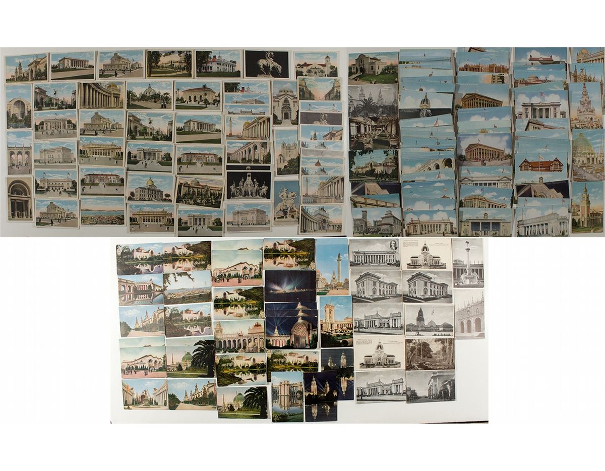 Lot of 225 postcards including duplicates. The vast majority are unused. Postcards fall into four categories: 1) mostly chrome, no border with white captions (135); 2) chrome, no white captions (30); 3) black and white (10); 4) white bordered (50). Some edge wear, overall a very nice collection displaying the many exhibits of this World's Fair. Please inspect. (Prag Collection)