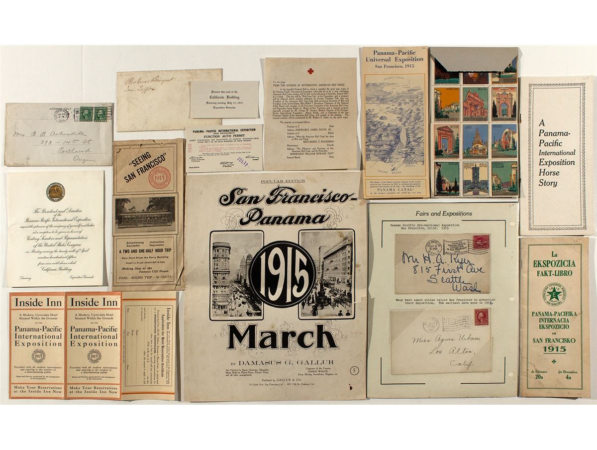 Lot of 13 brochures and other promotional ephemera. Includes: illustrated cover and brochure for the Inside Inn, the only motel on the expo. grounds; official poster stamps in booklet (38); 30 page pamphlet written in Spanish; pamphlet about horses (Iowa); illustr. 1914 brochure advertising the fair; "Seeing San Francisco" pamphlet (2.5 hour tour guide); two envelopes with Pan. Pacific stamp cancels; a formal invitation; Red Cross handbill; auto permit; and a large music sheet for the March by Damasus G. Gallur. (Prag Collection)