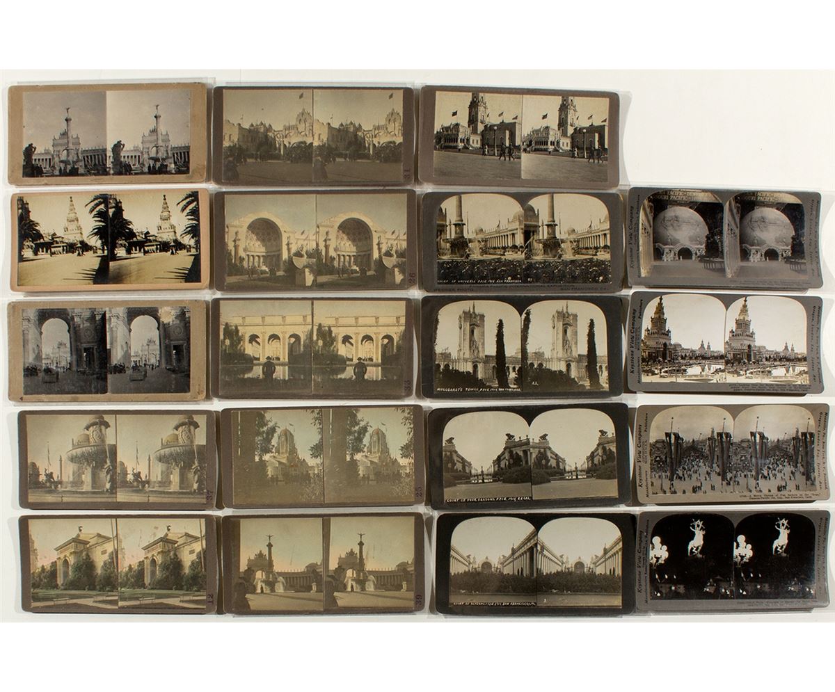 Fifteen different plus 4 Keystone duplicates (see other lot of 86 Keystone). Nearly all don't have a photographer identified. Includes: Court of Four Seasons, Mullgardt's Tower, Court of Universe (Weidner Photo), Buildings of the Nations, and then ten unlabeled. Keystone duplicates: 17793- "Zone", 17784--Railway Exhibit, 17776--Tower of Jewels, and 17806--Fountain of Energy at night. Nice variety. Overall, good condition. (Prag Collection)