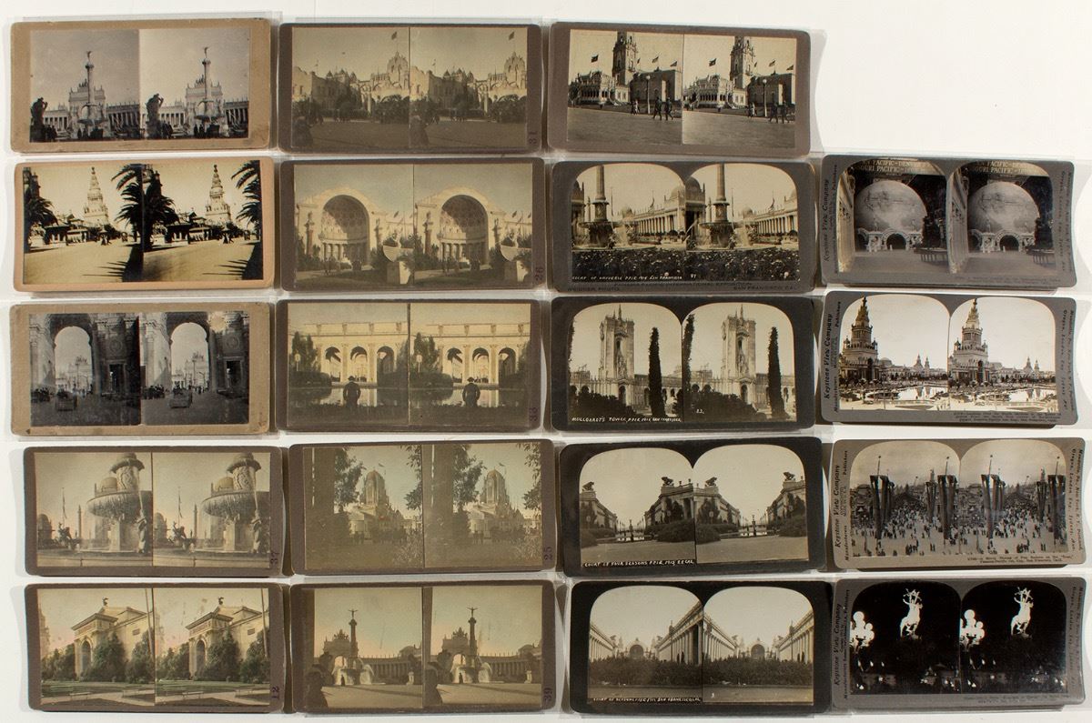 Fifteen different plus 4 Keystone duplicates (see other lot of 86 Keystone). Nearly all don't have a photographer identified. Includes: Court of Four Seasons, Mullgardt's Tower, Court of Universe (Weidner Photo), Buildings of the Nations, and then ten unlabeled. Keystone duplicates: 17793- "Zone", 17784--Railway Exhibit, 17776--Tower of Jewels, and 17806--Fountain of Energy at night. Nice variety. Overall, good condition. (Prag Collection) City: San Francisco State: California Date: 1915 ID# 27225