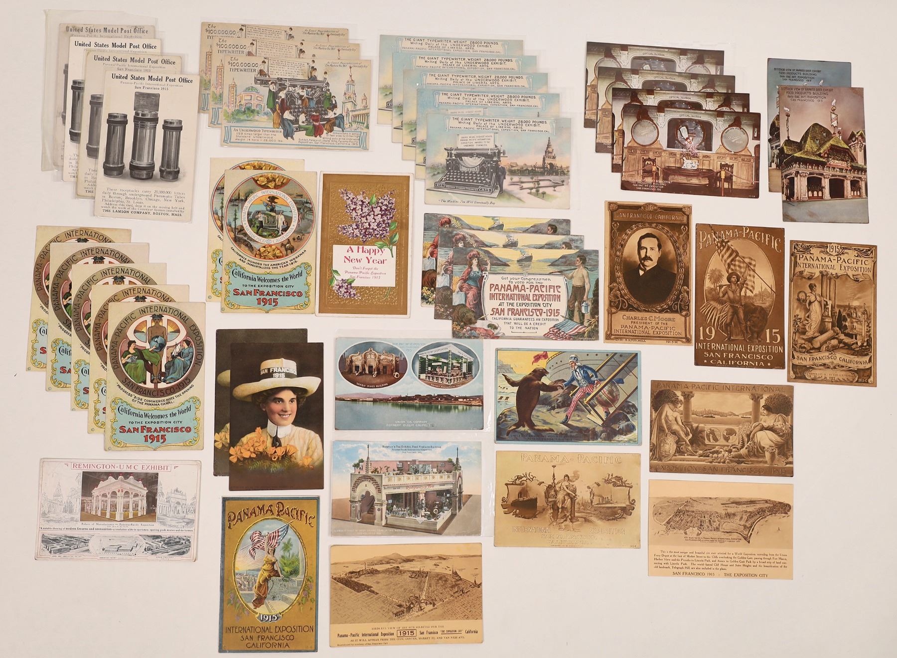 Contains 40 postcards commemorating the 1915 Pan Pacific Exposition in San Francisco. Besides scenic views of the exposition, there are a number of ad cards, including the 28,000 pound typewritersponsored by Underwood, Remington Firearms and a rare ad for pneumatic tube document transport within the post office. A system that is still in use at many businesses today. Some cards are used, others are blank. All are in good condition. Please see photos for detail and condition.