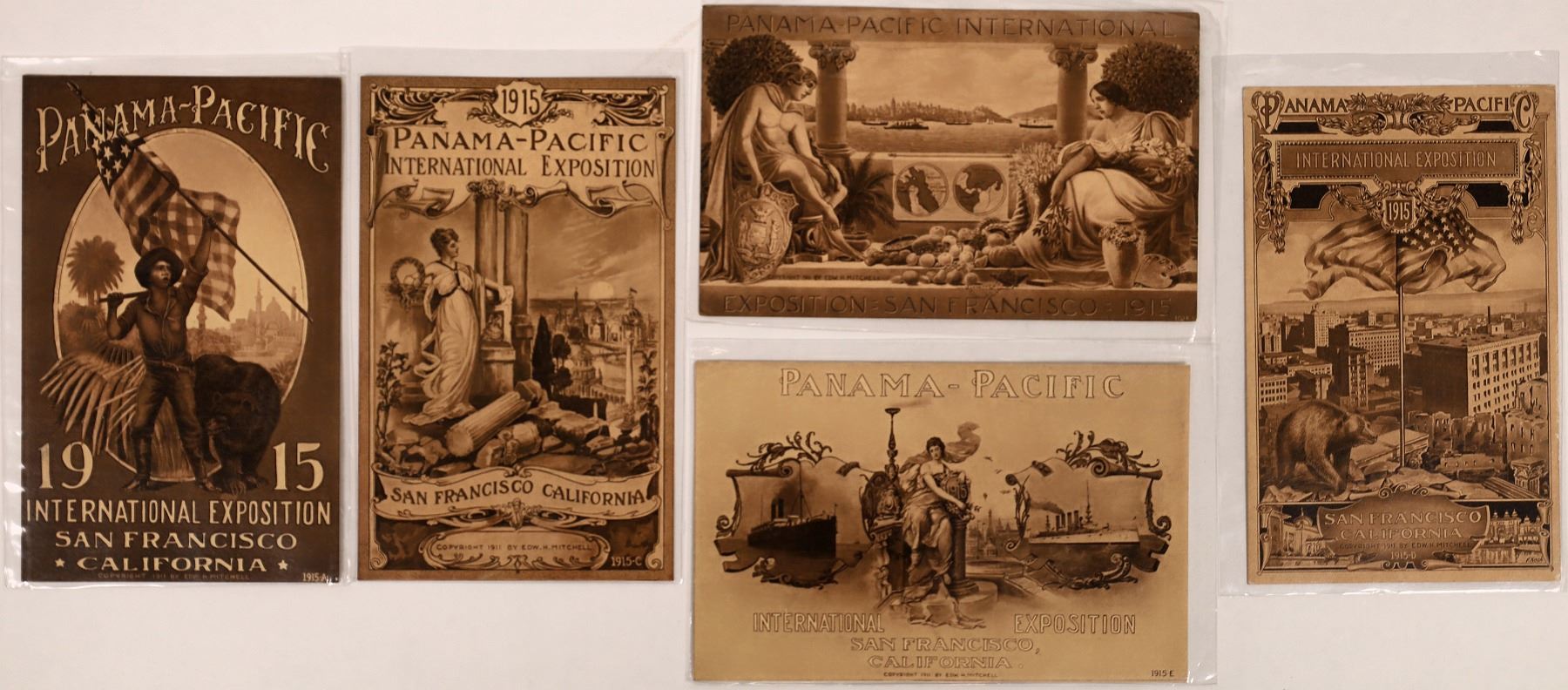 Five postcards advertising the Pan Pacific Exposition. Two of the cards are published by The Edward H. Mitchell Company of San Francisco the other three by The Exposition Publishing Company. All are in excellent, unused condition. Please see photos for more detail and condition.
