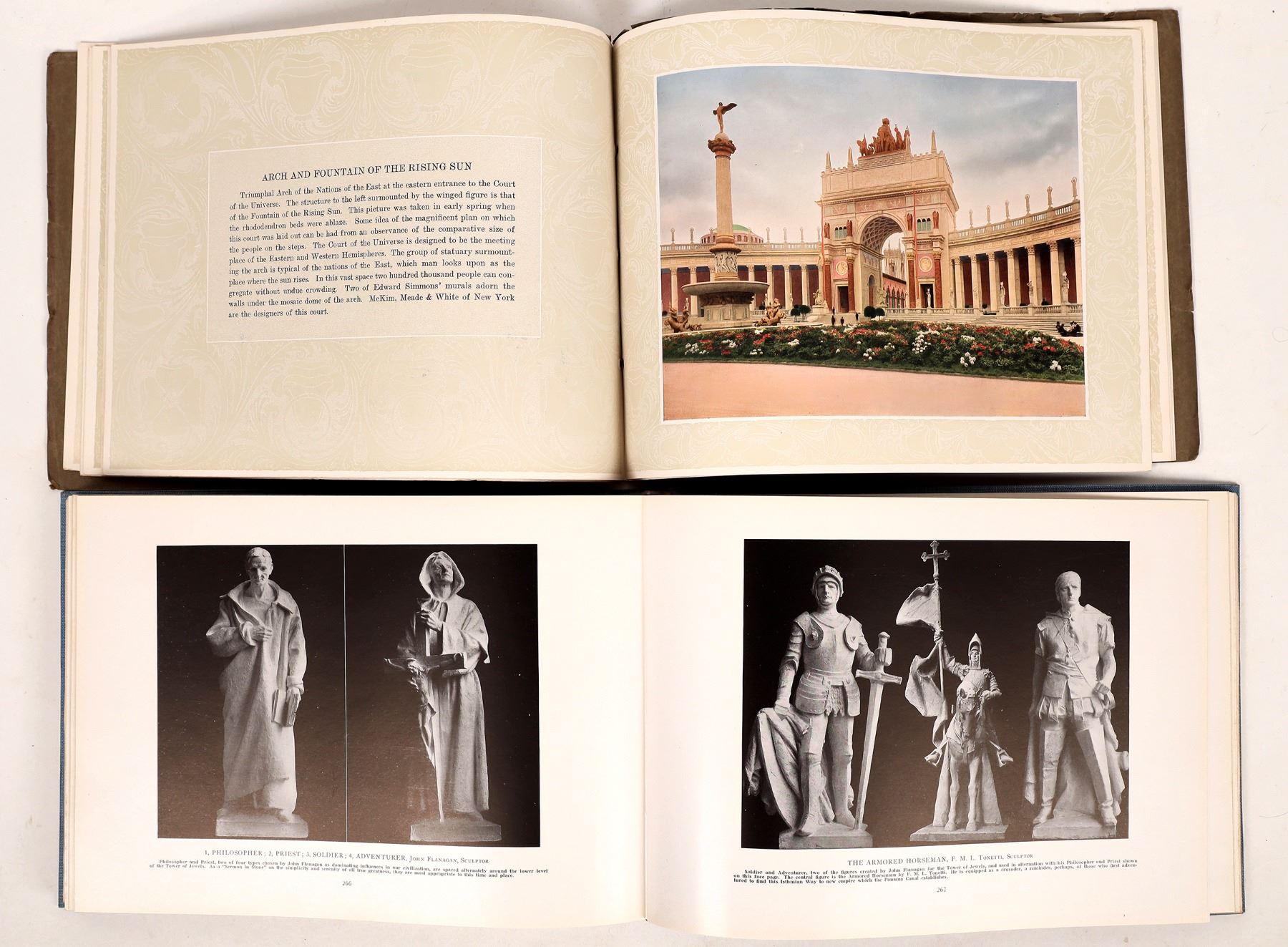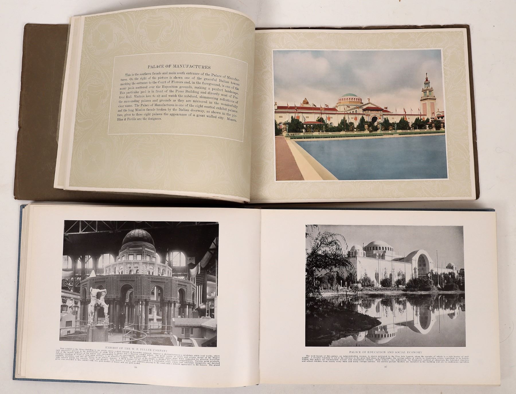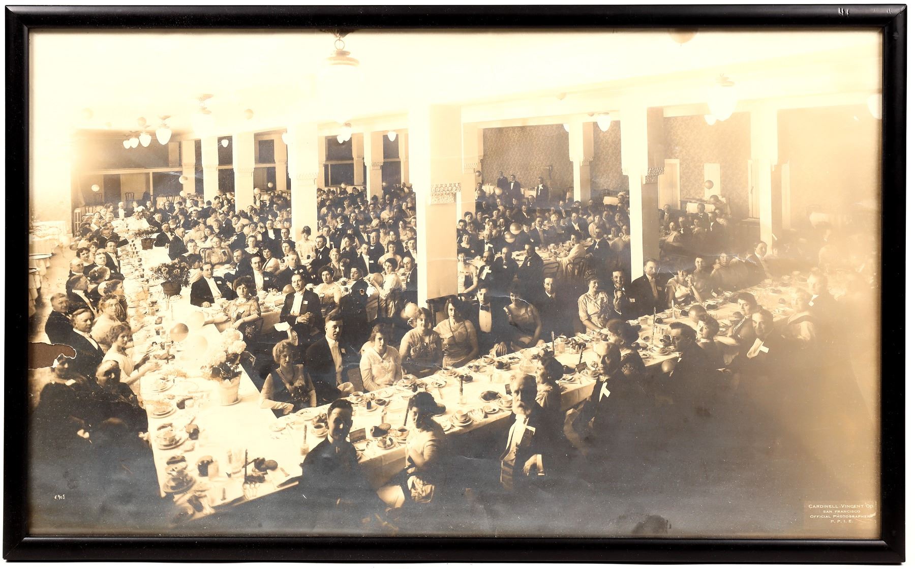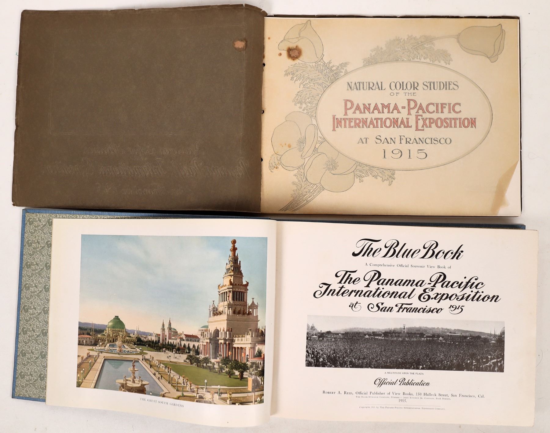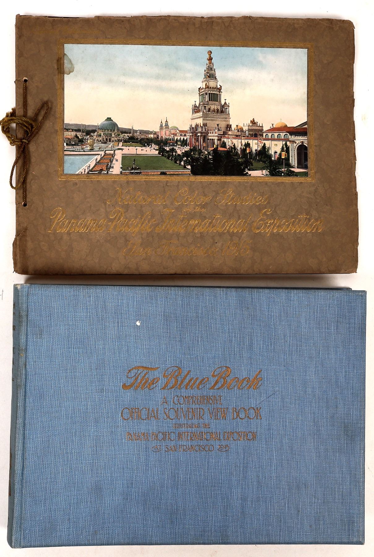 Nice group with very rare The Blue Book, a comprehensive official souvenir view book of the 1915 Expo. This is the key book that shows everything about the Expo, 328pp. Natural Color Studies of the Panama Pacific International Exposition, San Francisco, 1915 with color illustrations, 1" stain on cover. Framed photo of PPIE banquet by Cardinell Vincent with original label, a major Bay Area postcard company as well as photographer. The old man up front may be PPIE treasurer A W Foster, frame 12.5x20" with 1" left side damage. San Francisco Colorado