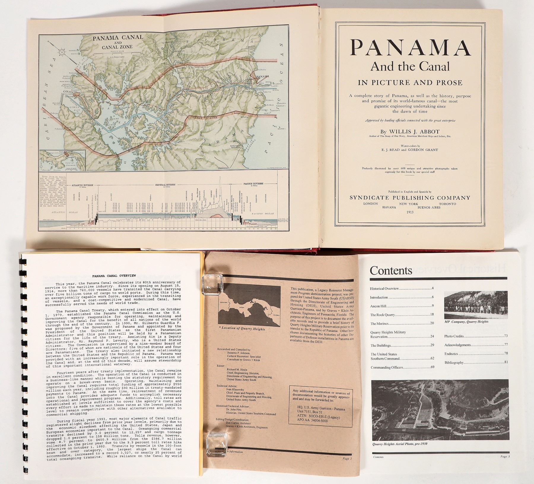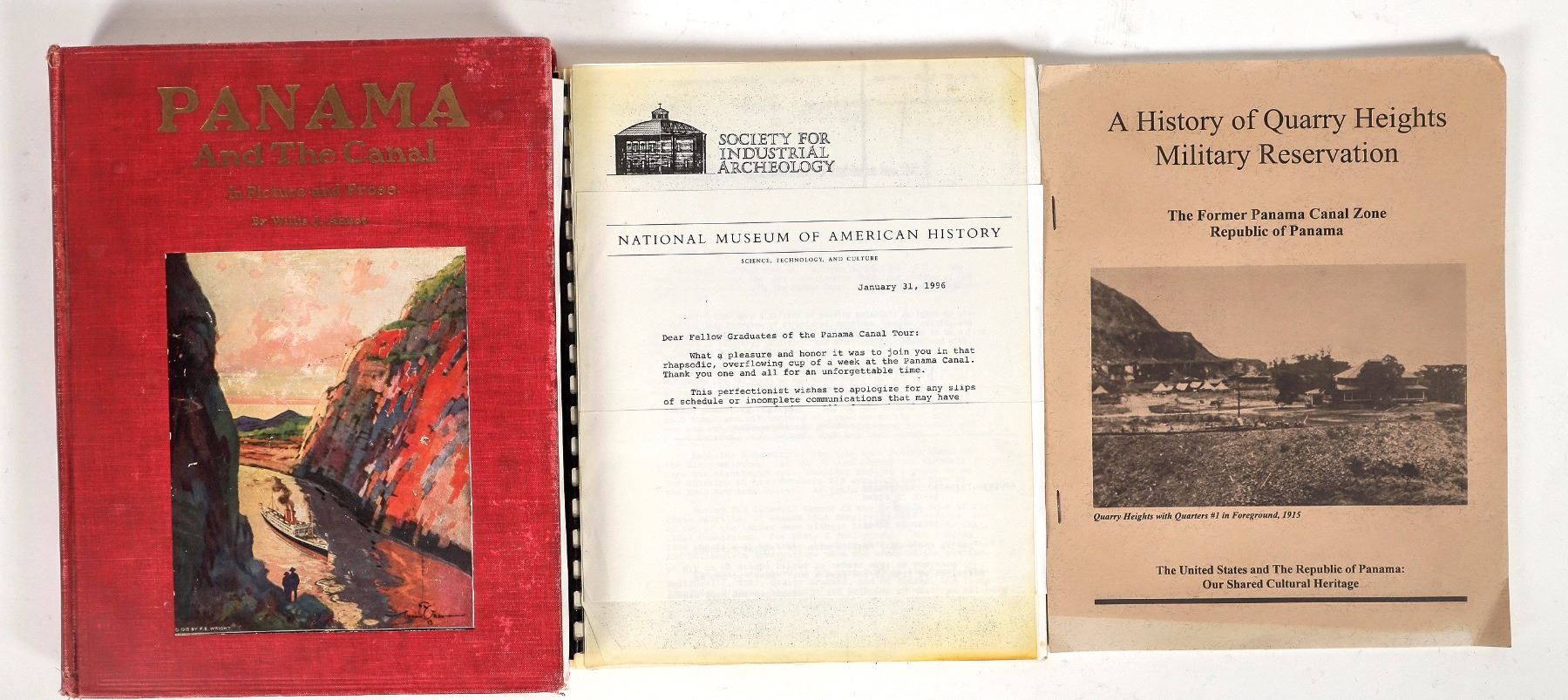 A group of 3 publications on the history of Panama and the Panama Canal: an informational publication for tourists on a Panama Canal tour from the National Museum of American History, 'A History of Quarry Heights Military Reservation: The Former Panama Canal Zone' published by the U.S. Army, and 'Panama and the Canal in Picture and Prose' by Willis J. Abbot. All three in good condition, some extremely minor cover wear on the Abbot book.