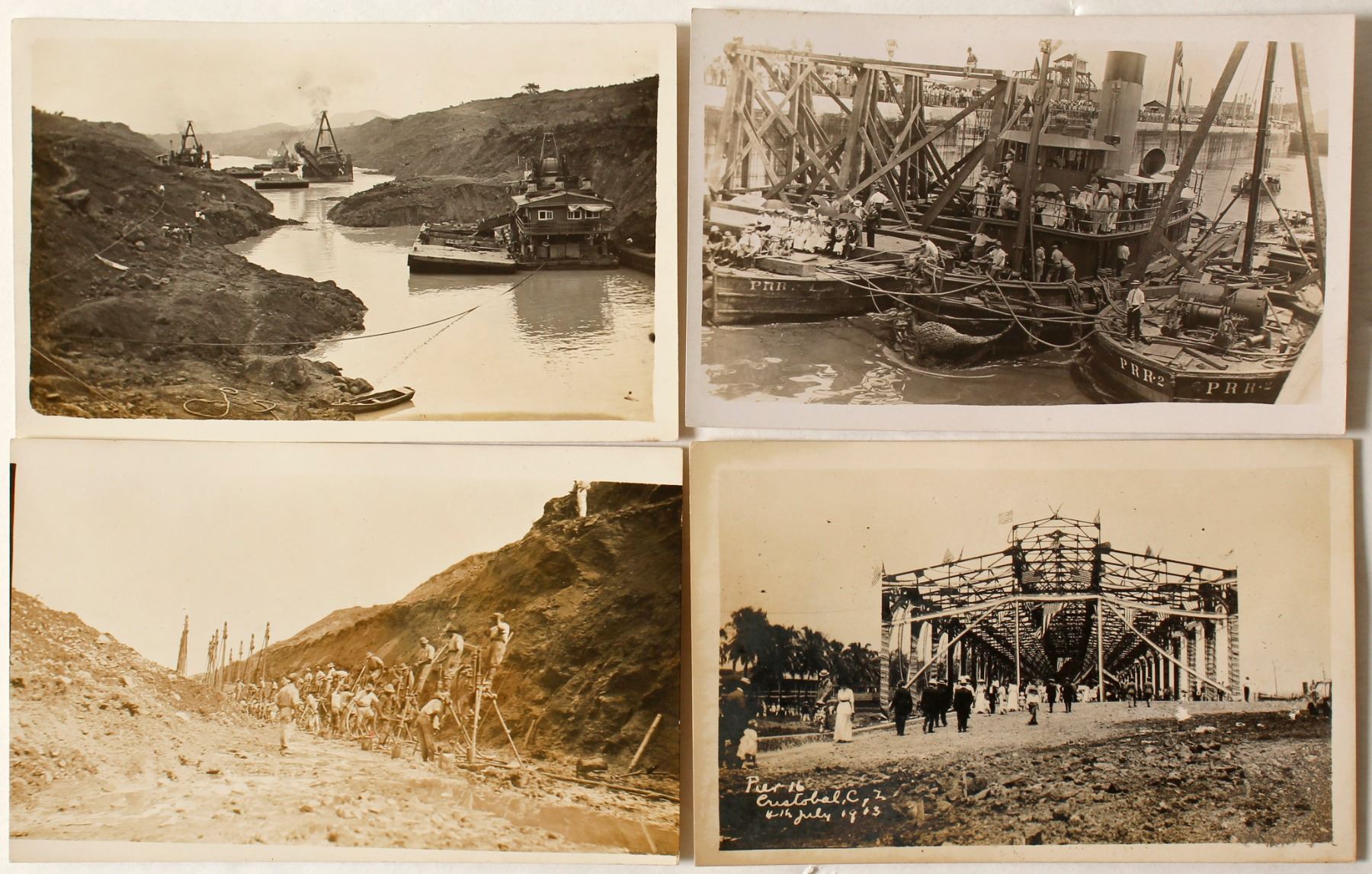 Lot of 4 different RPPC, c.1912. One shows people crossing a covered pier; another show three boats in the canal; another shows men working in a ditch; and the final shows dredging. All unmailed.
