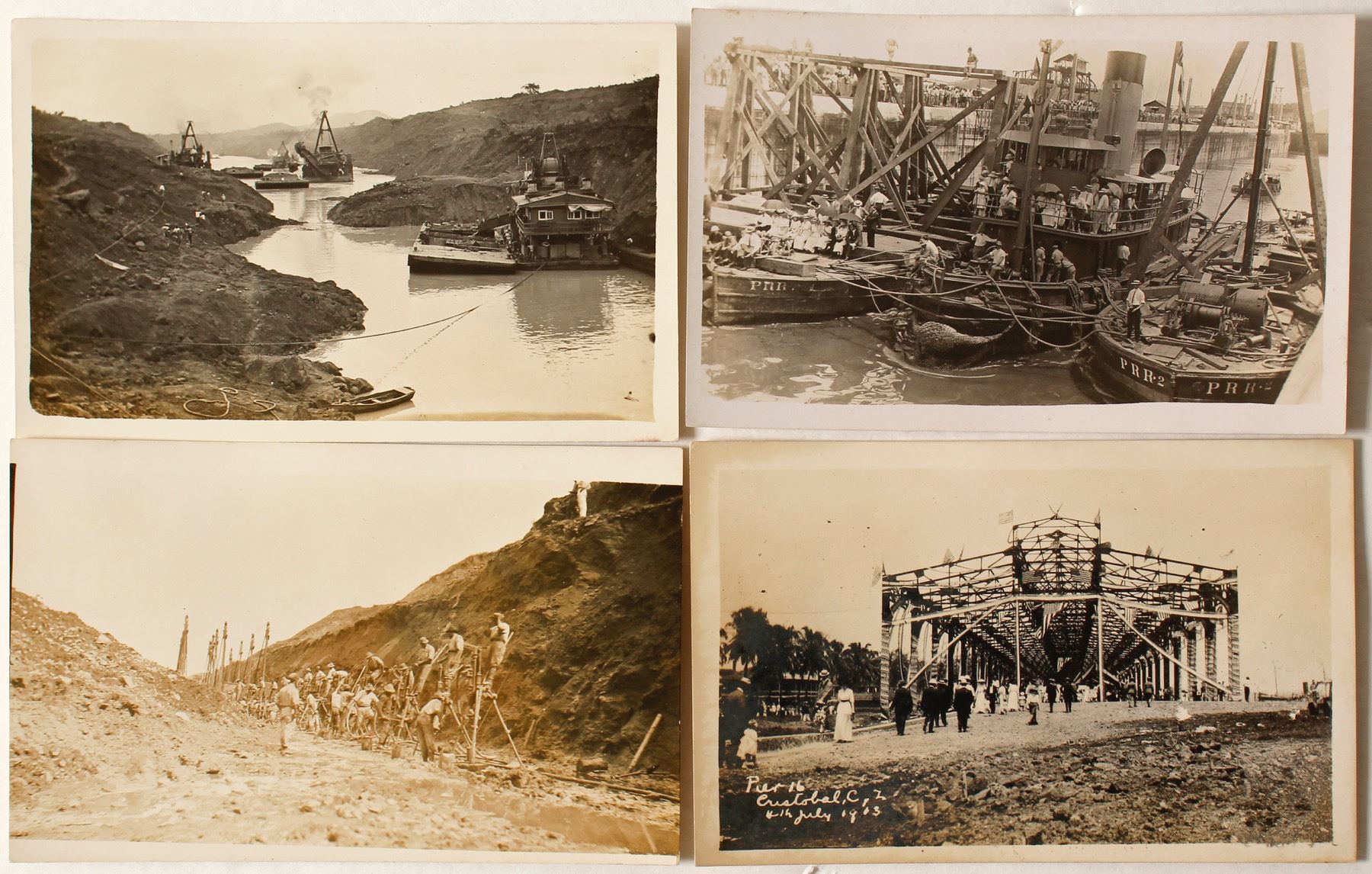 Lot of 4 different RPPC, c.1912. One shows people crossing a covered pier; another show three boats in the canal; another shows men working in a ditch; and the final shows dredging. All unmailed. State: Panama Al Adams Collection. HWAC# 58596
