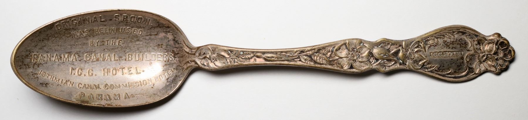 This is an original spoon used at the Isthmian Canal Commision Hotel in Panama by construction workers. The canal was opened to traffic in 1914.