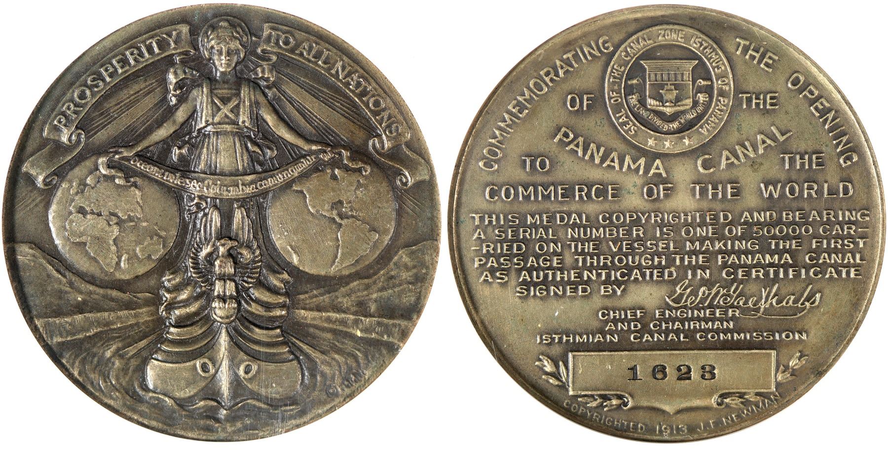 Obv: Involved design depicting boat passing through Canal, full female figure standing on prow, long rays from head and shoulders, arms outstretched; each hand rests on a world globe (eastern and western hemispheres); on ribbon, across body, connecting globes Oceani Inter Se Columbid Coniunguntur (translation: "Columbia unites the oceans"); above on ribbons, at head of figure, to l. Prosperity, to r. To All Nations; at lower r. edge, microscopic © J. F. N. Rev: At top Seal of Canal Zone; around top Commemorating the Opening, across of (Seal) The / Panama Canal / to the / Commerce of the World / smaller This Medal Copyrighted and Bearing / A Serial number is one of 50000 Car / -rried on the Vessel making the First / Passage Through the Panama Canal / as Authenticated in Certificate / Signed by / (signed) Geo. W. Goethals / Chief Engineer / and Chairman / lsthmian Canal Commission; below this is serial number (incuse) on panel or ribbon; below around microscopic Copyrighted 1913 J. F. Newman. HK-398 Bronze. 38mm. NGC certified MS 62. R4.