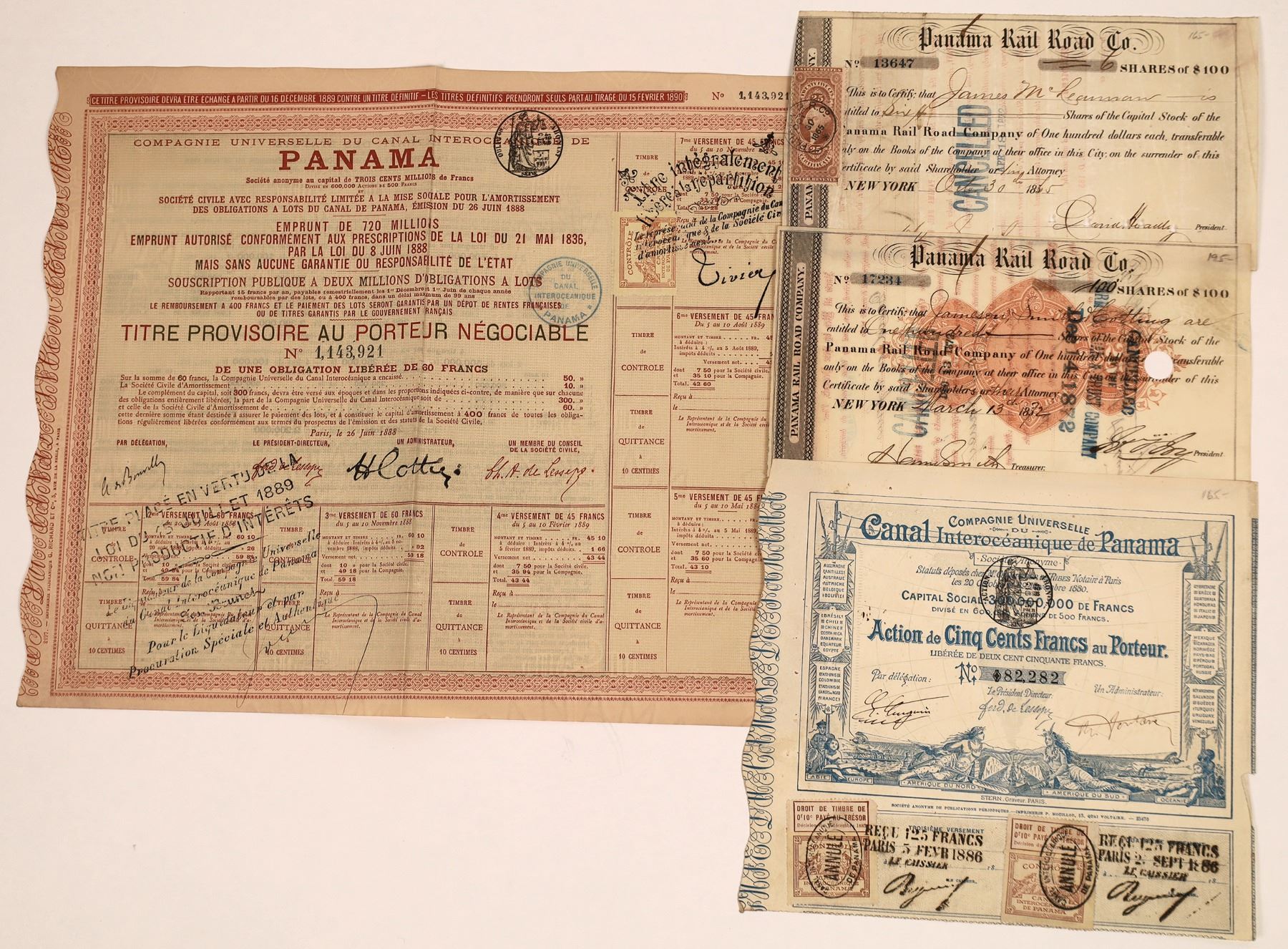 Lot includes a Compagnie Universelle Du Canal bond issued in France in 1888. Also, two certificates from the Panama Rail Road Co. stating the holder was entitled to shares in the company dated 1865 and 1872. Both of these are canceled. One has a large imprinted revenue stamp and the other has a 25 cent revenue stamp attached. Lastly, a small bond from Compagnie Universelle Du Canal Interoceanique de Panama, 1880. A very nice Panama Canal representation. View photos to inspect.