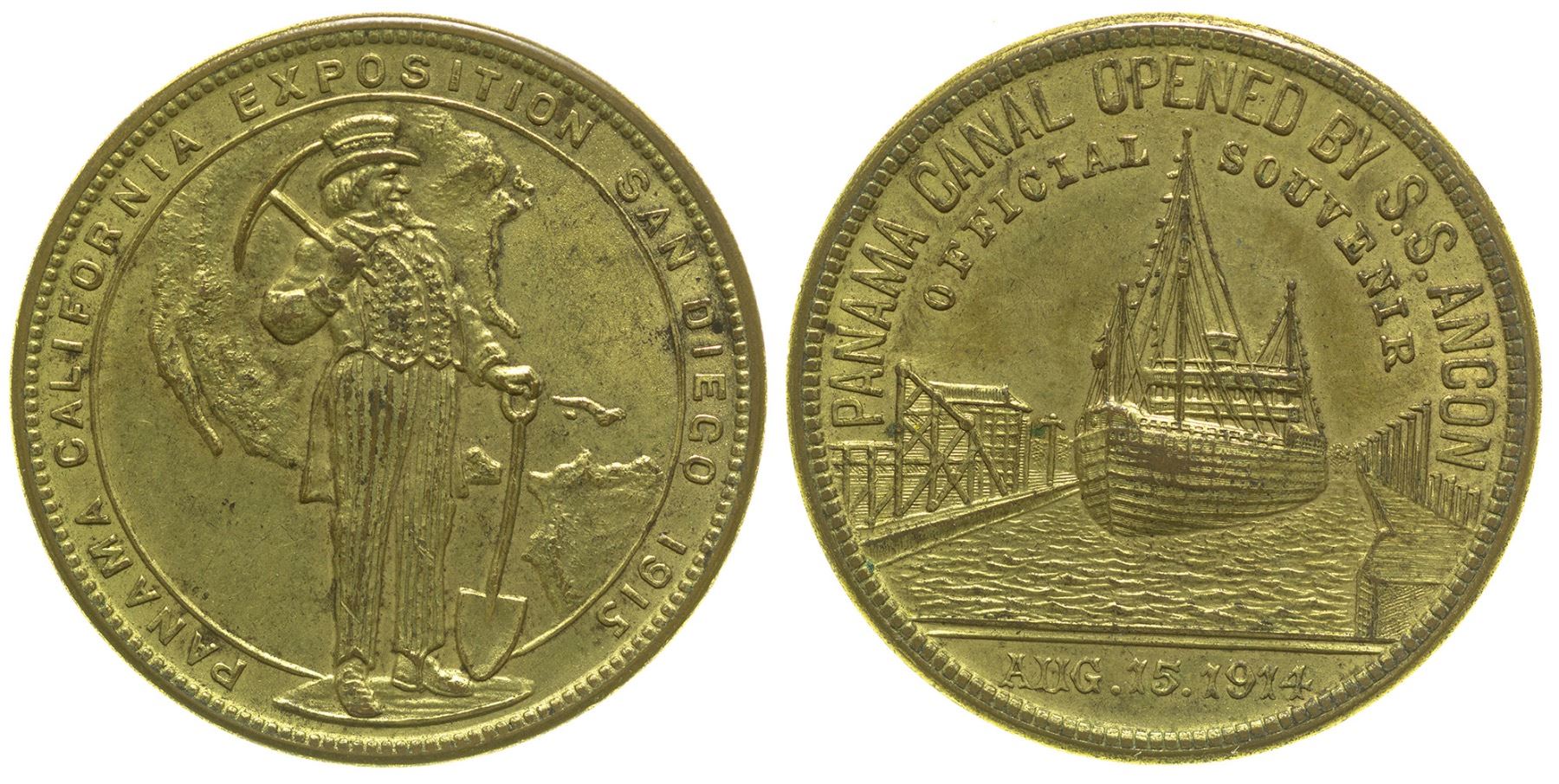 HK 428. AU, Br., 34mm. Obv.: Panama Canal Opened by S.S. Ancon / Aug. 15, 1914; Rev.: Panama California Exposition San Diego 1915. City: San Diego State: California Date: 1914 HWAC# 53807
