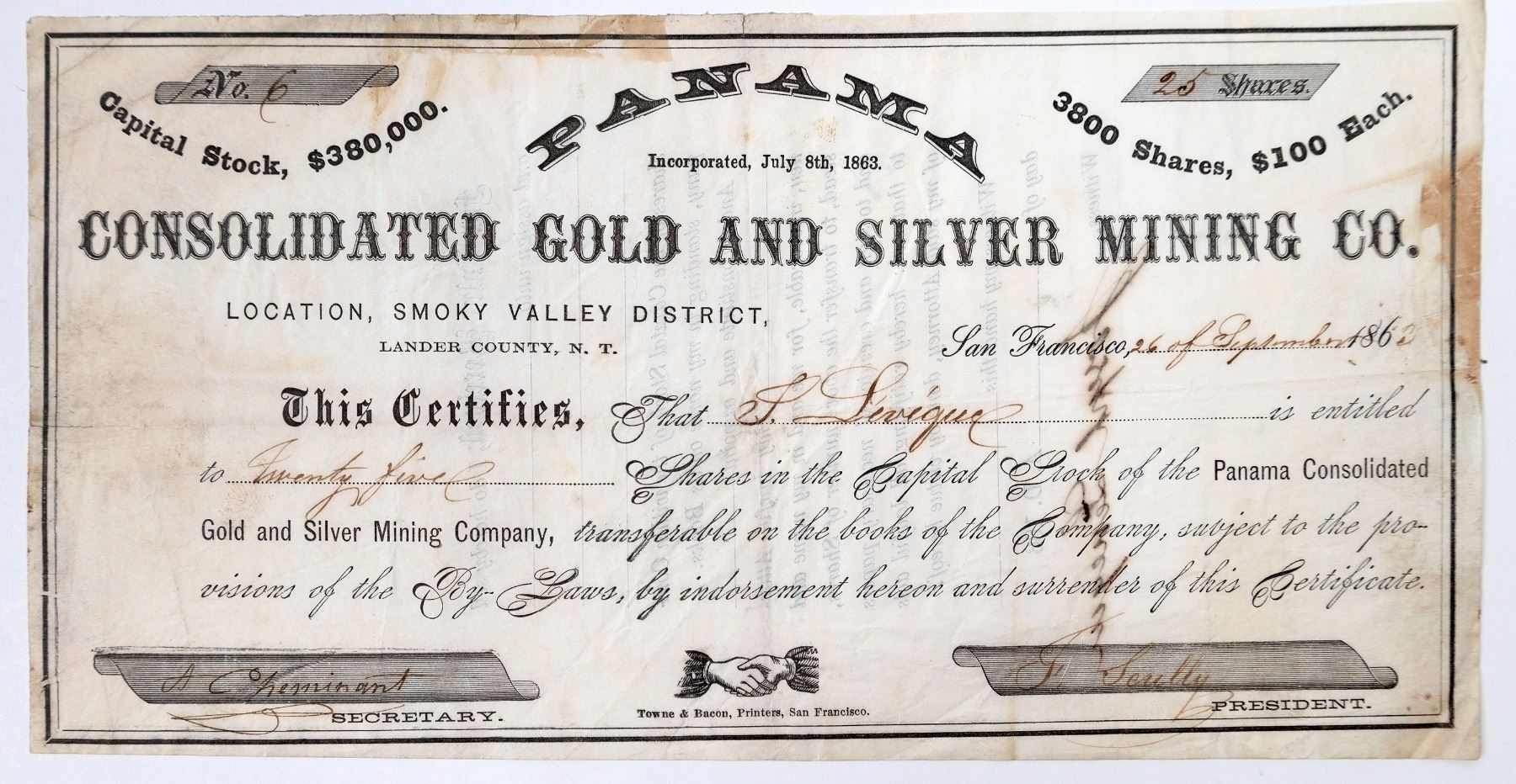Very early # 6 for 25 shares to P. Levigue. Signed by A. Cheminant and president F. Seully. Dateline September 26,1863 San Francisco. Incorporated July 8, 1863. Not cancelled. Towne & Bacon printer. Edge staining, wrinkles and rips. Still good. Location: Smoky Valley District, Lander County, N. T. On August 3, 1863 the Daily Alta California printed a letter from the Reese River District. It says, "The Smoky Valley District contains some of the richest ores to be found, and here can be seen ledges, from ten to one hundred and fifty feet, with croppings from five to twenty-five feet, and in some instances plainly traceable for miles."_x000D_