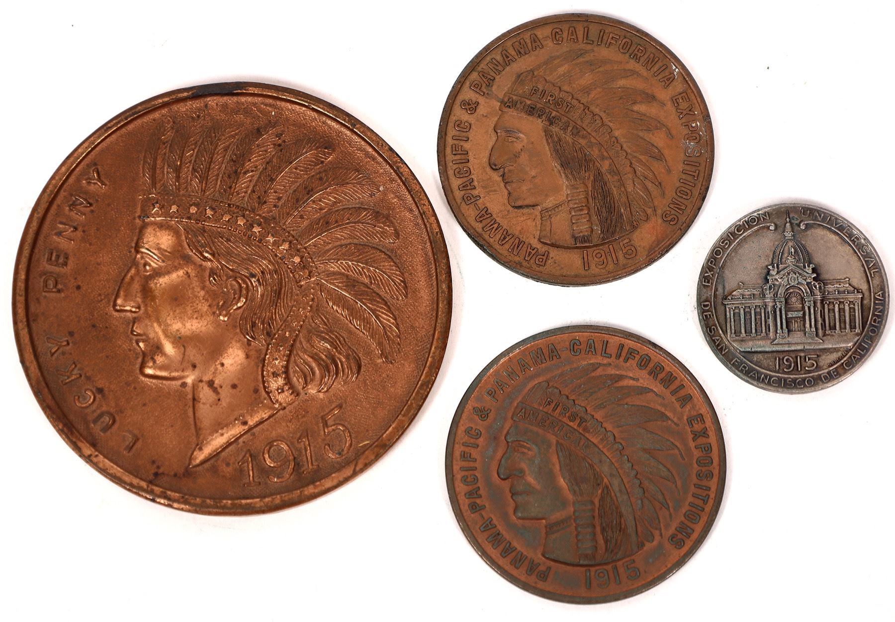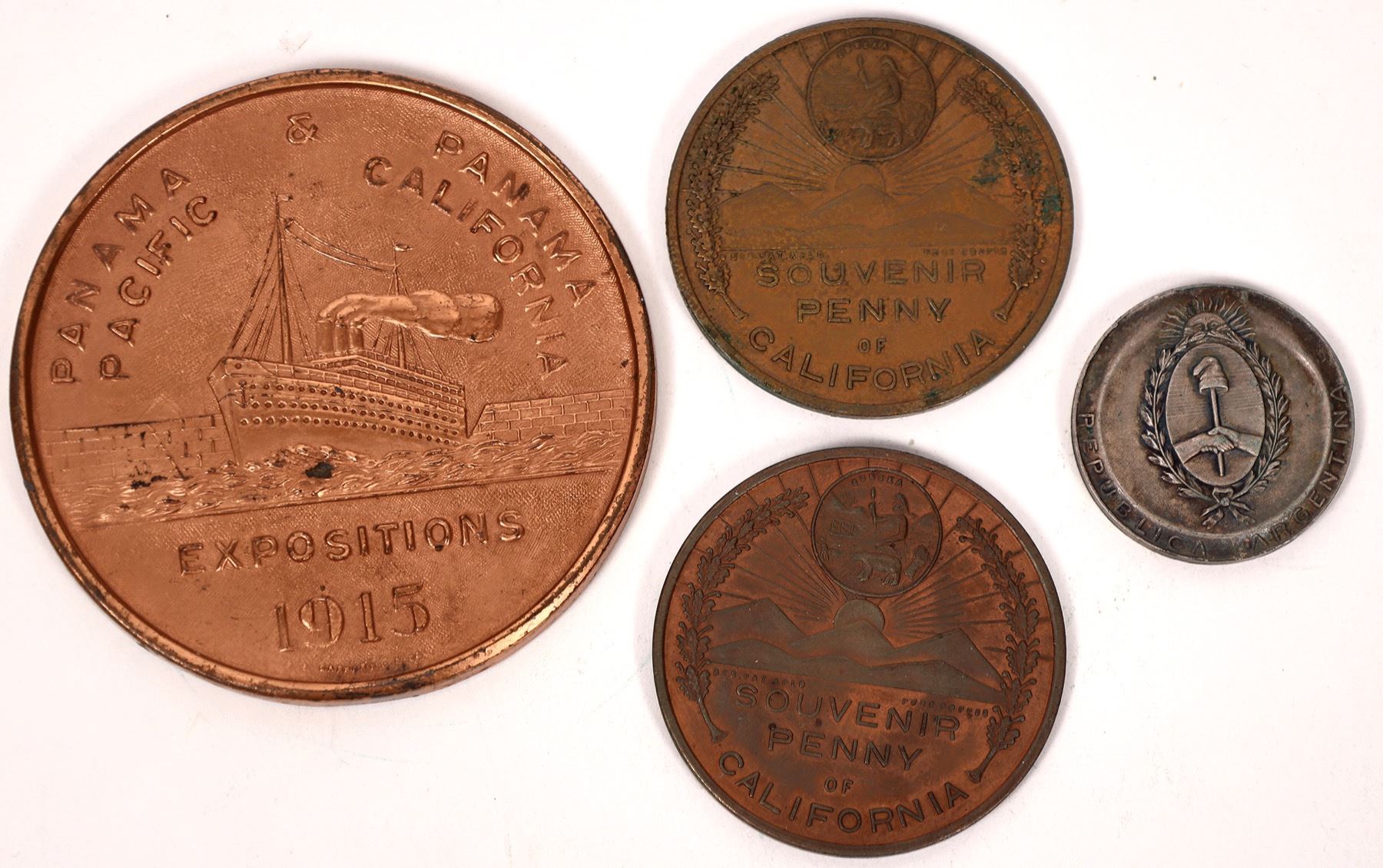 Four medals from the two 1915 California Panama Canal expositions. 1) Republic of Argentina commemorative medal. Produced and signed by Shreve & co. Silver-plated, 31 mm, AU. 2) First American Souvenir Penny. Obverse portrait of an Indian in feathered headdress, PANAMA-PACIFIC & PANAMA-CALIFORNIA EXPOSITIONS / 1915. Revers design of sun rising over mountains with the state seal at top. SOUVENIR / PENNY / OF / CALIFORNIA. Copper, 45 mm, AU. 3) A second Souvenir Penny of California; 4) 1915 Lucky Penny. Reverse ship passing through canal locks. PANAMA / PACIFIC & PANAMA / CALIFORNIA / EXPOSITIONS / 1915. Brass, 71 mm, AU. City: State: Date: