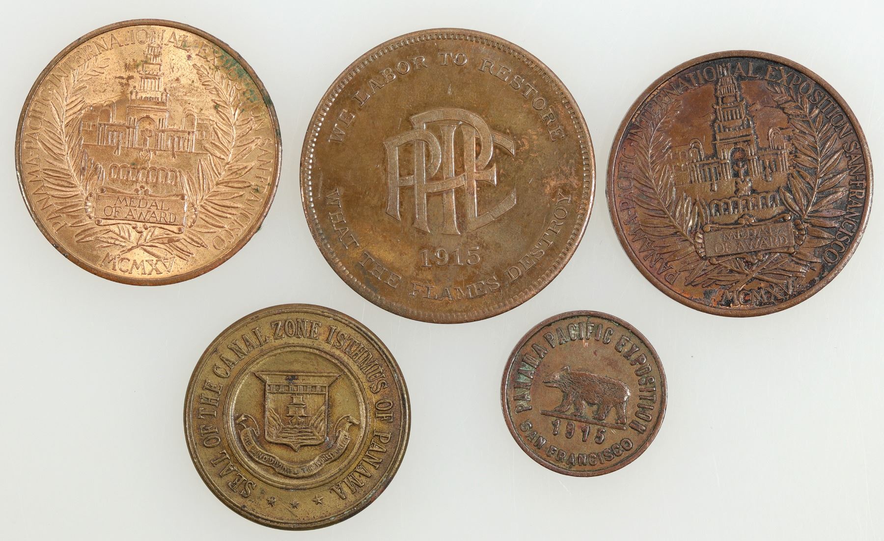 Lot of five medals from the Panama Pacific Exposition of 1915: Hartford Fire Insurance; Eastside Beer Gold Medal Winner (2); Cocoabola Wood Used on Panama Railway; Pan Pacific Token. 1915