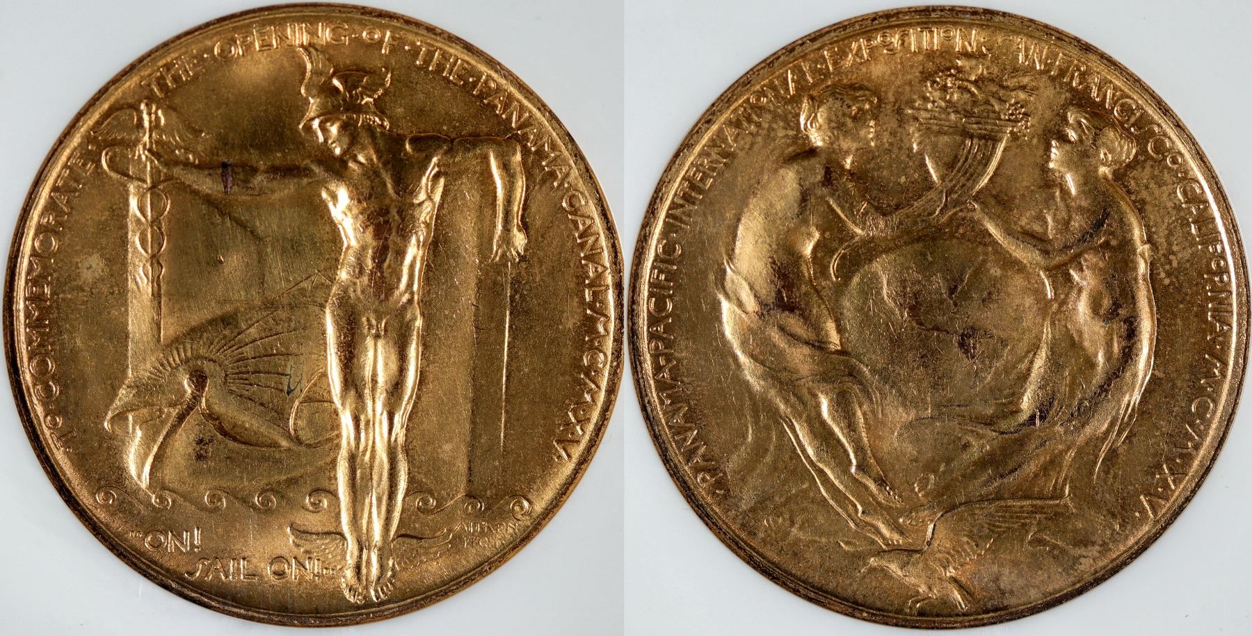 Obv: Winged Mercury opens Canal locks, through which passes Argo, symbol of navigation, setting sun reflecting on her sails; below vessel "On! / Sail On!"; at lower r. edge Aitken / Fecit.; legend around • To • Commemorate • the • Opening • of • the • Panama • Canal • M•C•M•X•V• Rev: Two females, representing the two hemispheres, entwined about earth and holding in hands cornucopias; below, seagull, bird of Canal Zone; around • Panama-Pacific • International • Exposition • San • Francisco • California • M•C•M•X•V• HK-401 Gilt. NGC MS 65. Census shows 32 in MS65, only 13 higher grade.