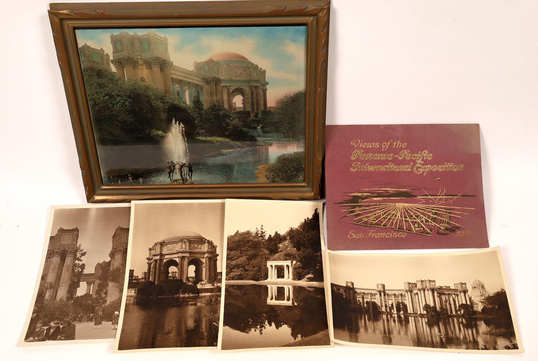 Brochure "Views of the Panama-Pacific International Exposition" (10 x 8 inches) with over a dozen views of the 1915 Fair. Framed color watercolor of the Palace of Fine Arts, 16 x 14 inch frame. Four B&W photos from the fair, about 6 x 10 inches.