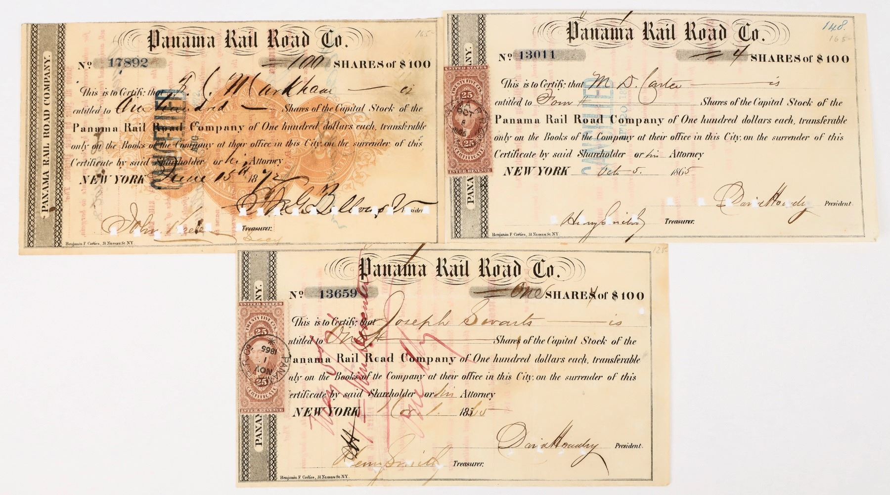 Lot of 3, two different varieties. Issued 1865 (x2) and 1872 (with RN-U1). All punch cancelled. Panama Canal Railway, a railway line that runs parallel to the Panama Canal, linking the Atlantic Ocean to the Pacific Ocean in Central America. Route stretches 47.6 miles across the Isthmus of Panama from Colon (Atlantic) to Balboa (Pacific). It is operated by Panama Canal Railway Co. Panama Canal Railway currently provides both freight and passenger service. Rail line built due to increase in traffic to California with the 1849 Gold Rush. Construction began in 1850, 1st train on Jan. 28, 1855. Became one of the most profitable railroads in the world. Passengers paid $25 each to travel 47 miles. Railroad built and originally owned by Panama Rail Road Co., chartered by the State of New York on April 7, 1849.