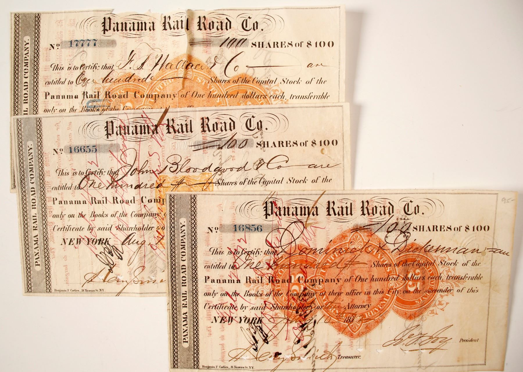 Three different Panama Railroad stocks with slightly different RNs. #16856 1872 with a U1 in deep (red) orange, and #17777, 1872 with a regular yellow-orange (torn). The third piece is unlisted in Castenholz, with a RN T , but difficult to read the variety of RN T through the print. State: City: Date: HWAC# 83719