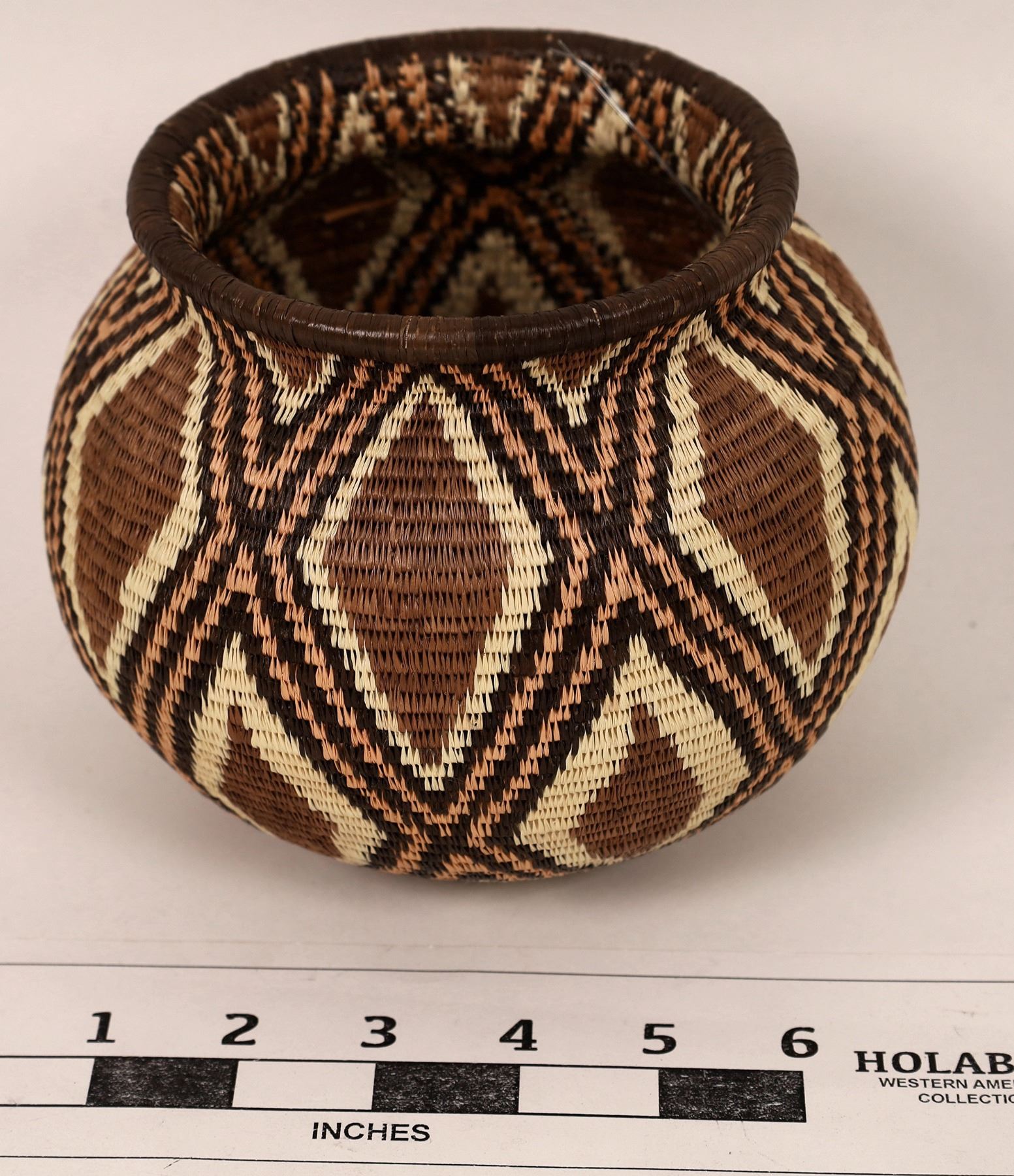 The Wounaan Embera tribe of Panama is known for these tightly woven baskets with bold geometric patterns. Sometimes referred to as Rainforest Baskets because of their place of origin, the Wounaan create these beautiful works for the tourist trade in a traditional olla (water carrier) shape. This one is approx 6-1/2 inches in diameter and 5-1/4 inches tall with a 4-1/2-inch opening at the top. It is in excellent condition. See photo for coloration and conditions.