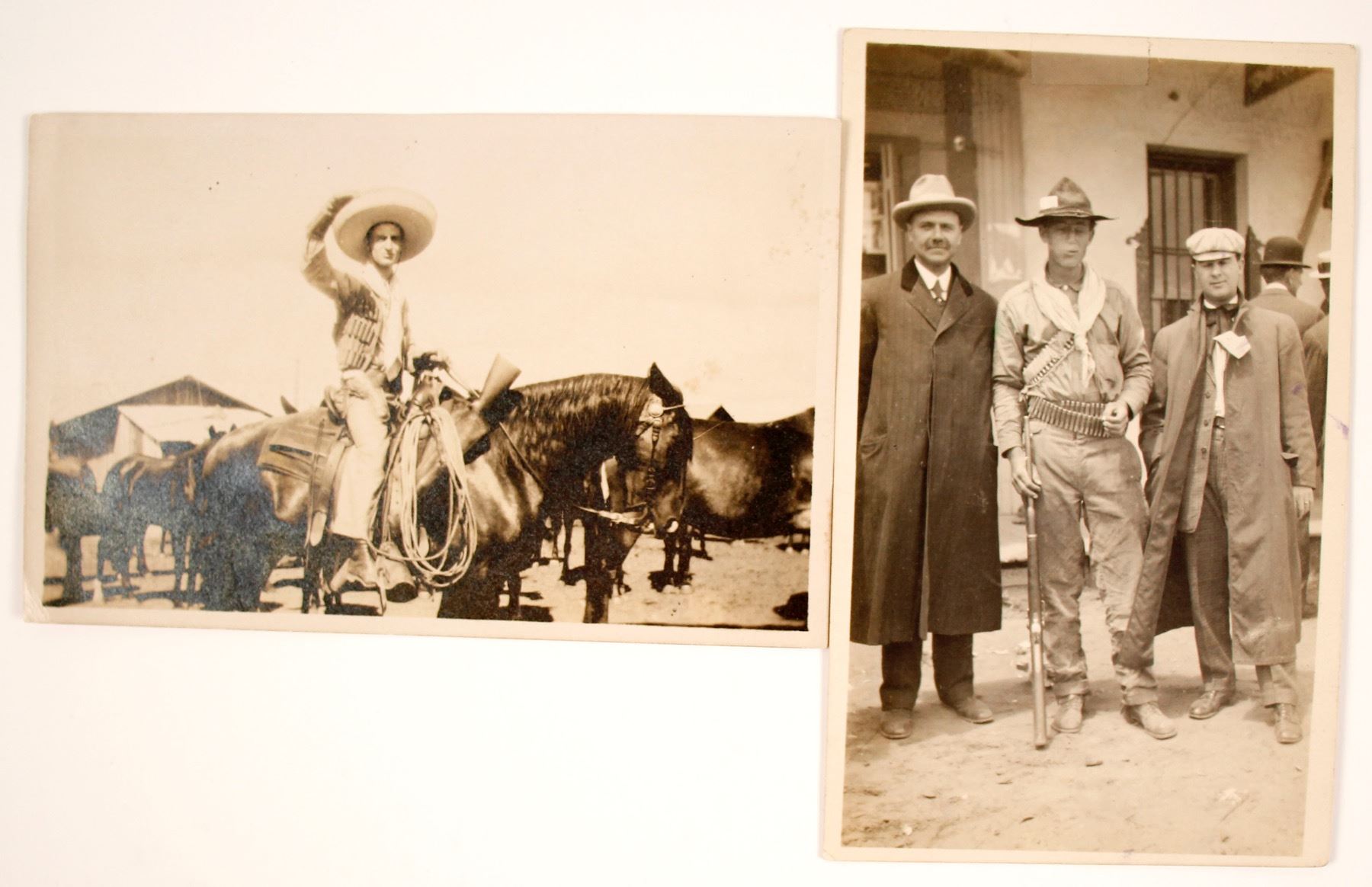 Lot of 2. 1) RPC of Mexican soldier on horseback with rifle, holstered revolver, and US saddle with toe fenders. Not mailed. c.1920-24. 2) RPC of early US Mounted Inspector Guard and two other men. c.1915. Not mailed. One is identified on the reverse as Arthur Anderson. Congress authorized mounted guards for the border in 1915. They had to furnish their own horse, guns, had no official uniform. The US Border Patrol was not formed until 1924. Date: City: State: HWAC# 77570