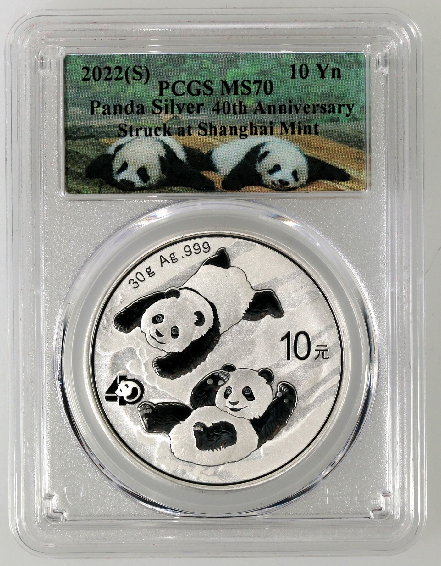 PCGS graded MS 70 2022(S) 10 Yuan Panda Silver 40th Anniversary struck at Shanghai Mint. With red velvet pouch and original brochure.