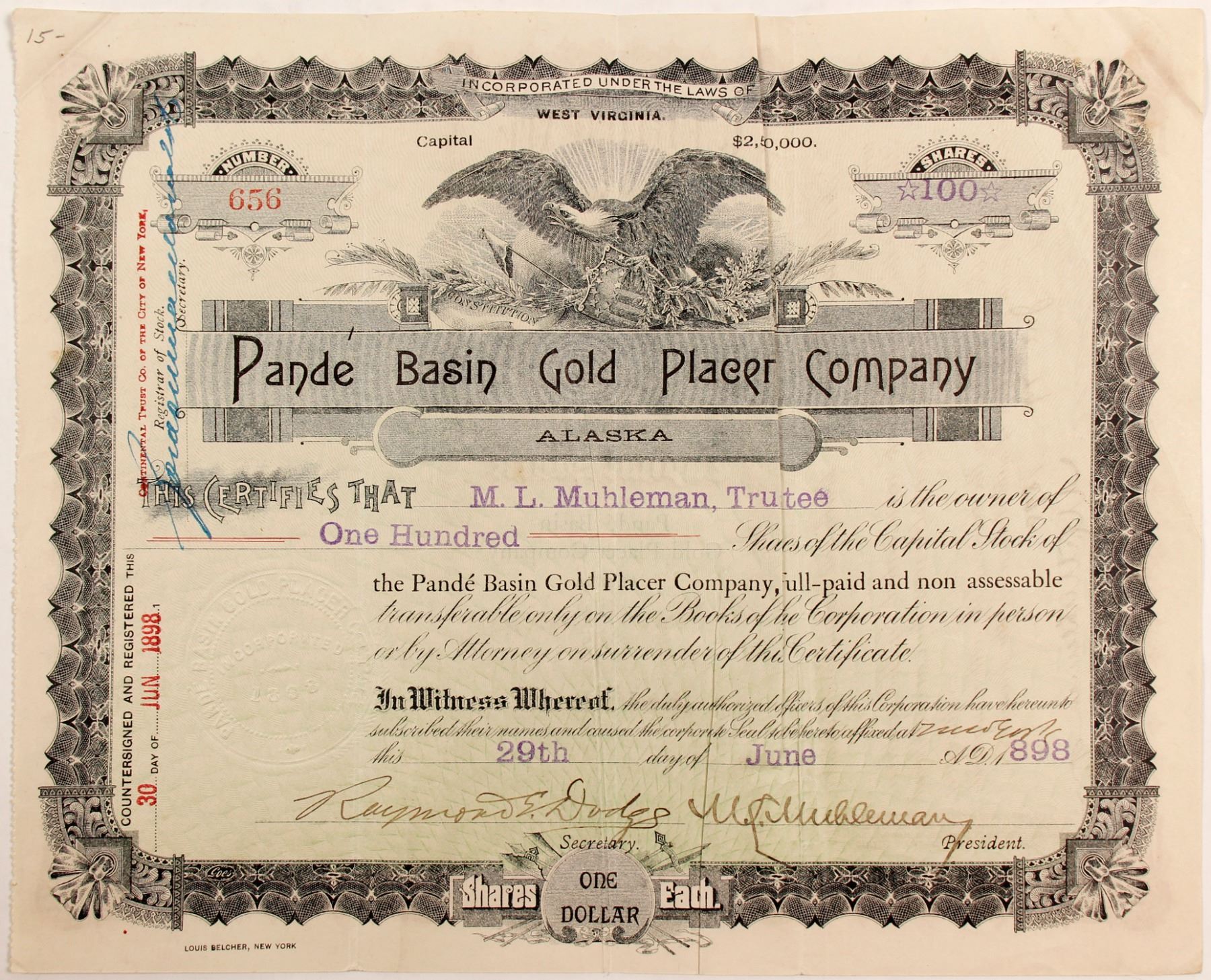 One Hundred capital shares of Pande Basin Gold Placer Company, number 656, dated June 29, 1898, printed by Louis Belcher issued to Maurice L. Muhleman, trustee, who was also a Deputy United States Assistant Treasurer and cashier of the local Sub-Treasury. Ken Prag Collection.