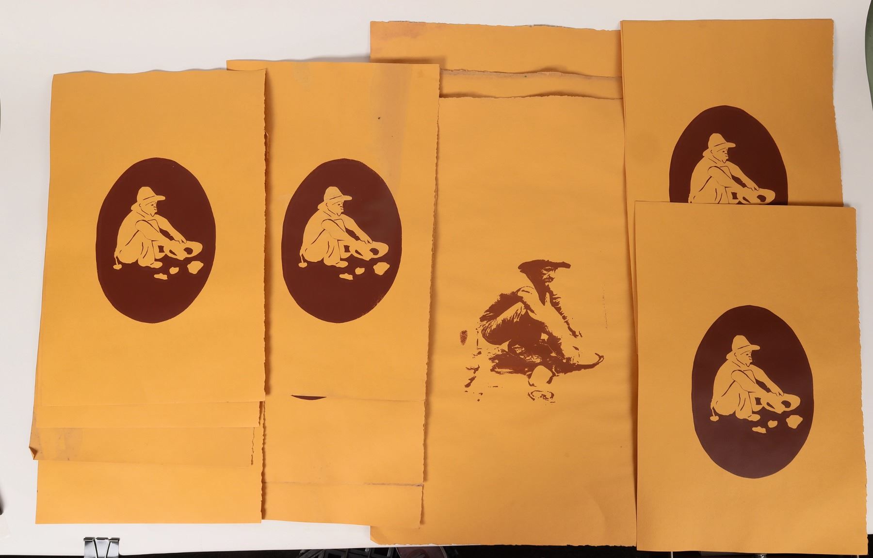 13 panning miner prints on heavy stock. 3x 26x20", 10x 20x13". A few have some stains.