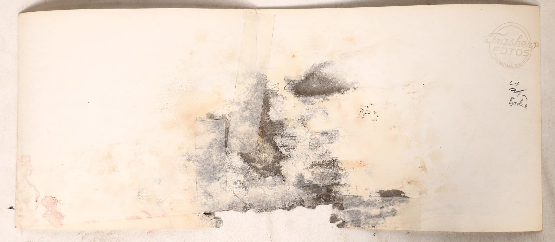 Frasher photo identified on front right corner and also on stamp on reverse - office in Pomona. Shows entire town including cemetery, mines, mills, church, residences, etc. Serious condition issues. Area loss on bottom- 5”vertical crease, water damage, old tape repairs. But still a Frasher treasure! Bodie California Franklin Collection