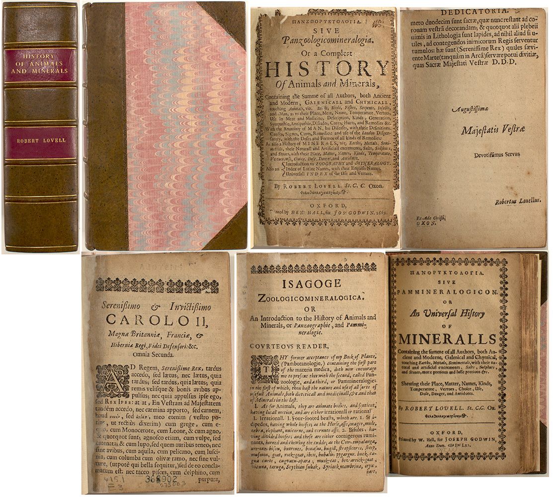Two parts in one volume. Part 1 is 528pp, part 2, A Universal History of Minerals, is 152 pp. Noted as very rare, this is the only copy we’ve seen come up for auction in over thirty years. This work by Lovell is remarkable. It summarizes all of the animals known at the time- written in the post medieval period. Though written during the Renaissance, it contains information that was a holdover from medieval times, such as a description and discussion of the unicorn, which they believed was a real animal. Mineralogists and mining historians will be fascinated by the discussion of minerals. Here the uses of the minerals are described in great detail, especially their use in pharmacology and in, one might argue, the “black arts”. Handsomely and professionally rebound.City: County: State: Date: