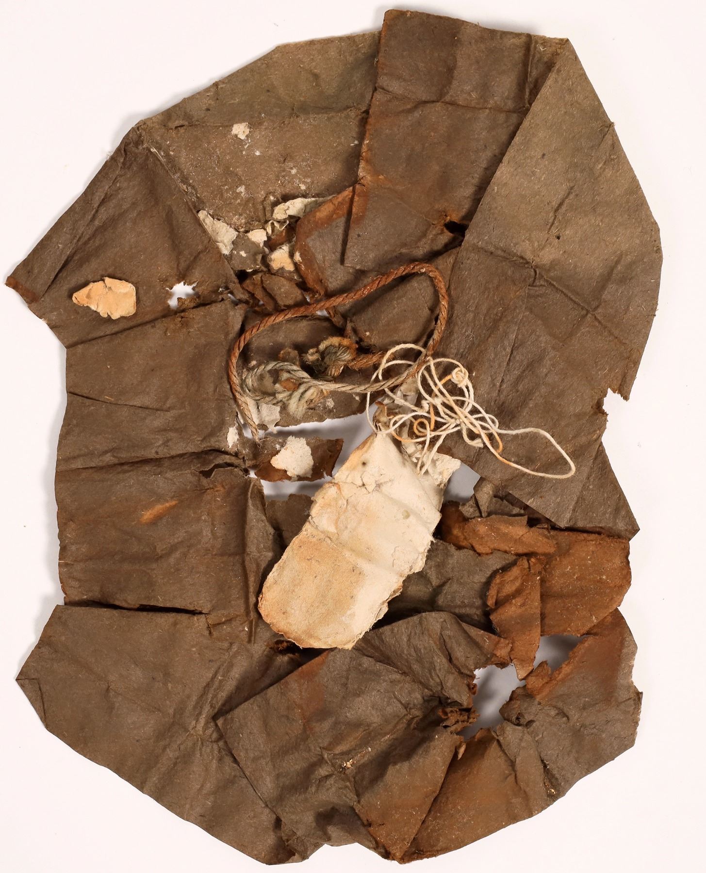 Flattened paper box with a folded paper note inside. Box 6.5x5", folded note 1" wide, length not measured due to fragile nature. 6" string present. Stained.