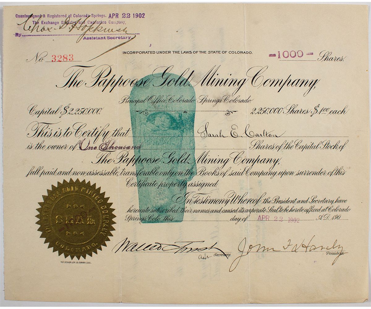 Incorporated in Colorado. Cert. #3283. Uncancelled. Issued to Sarah E. Carlton for 1000 shares on Apr. 22, 1902. Signed by John F. Hardy (president) and Walter Frost (ass’t secretary). Wonderful underprinted vignette of a baby (papoose) in a cradleboard. No border design. Black print with a gilt seal. Reverse is endorsed by Carlton. Printer: Denver Lith. Co. Measures 7.5 x 9.25.” The company’s claims included the Ray, Petrel, Cuckoo, Guess, 20 acres on Squaw Mountain. “A promising vein shows on Ray” [pg.87, Cripple Creek and Colorado Springs Illustrated, Warren Stride Pub., Colorado Springs, CO., 1896].City: Colorado SpringsCounty: El PasoState: CODate: 1894