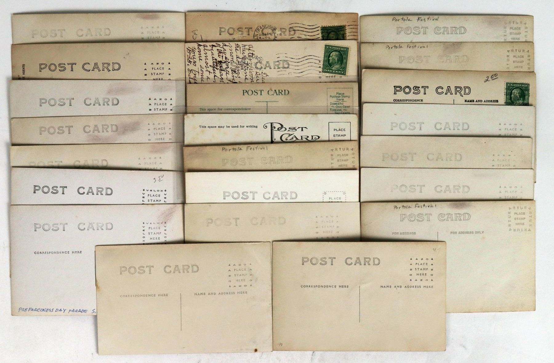 A collection of 23 postcards of parades and festivals in San Francisco, CA, c1909-14. Includes 21 RPCs, 2 chromolithos. Fantastic pageantry. Includes: Pres. Roosevelt's visit, 1938; Verdi Day, Golden Gate Park, 1914; Xmas Eve Concert, 1911, at Lotta's Fountain, R.J. Waters & Co.; Portola Festival, 1913, Morton & Co.; etc.