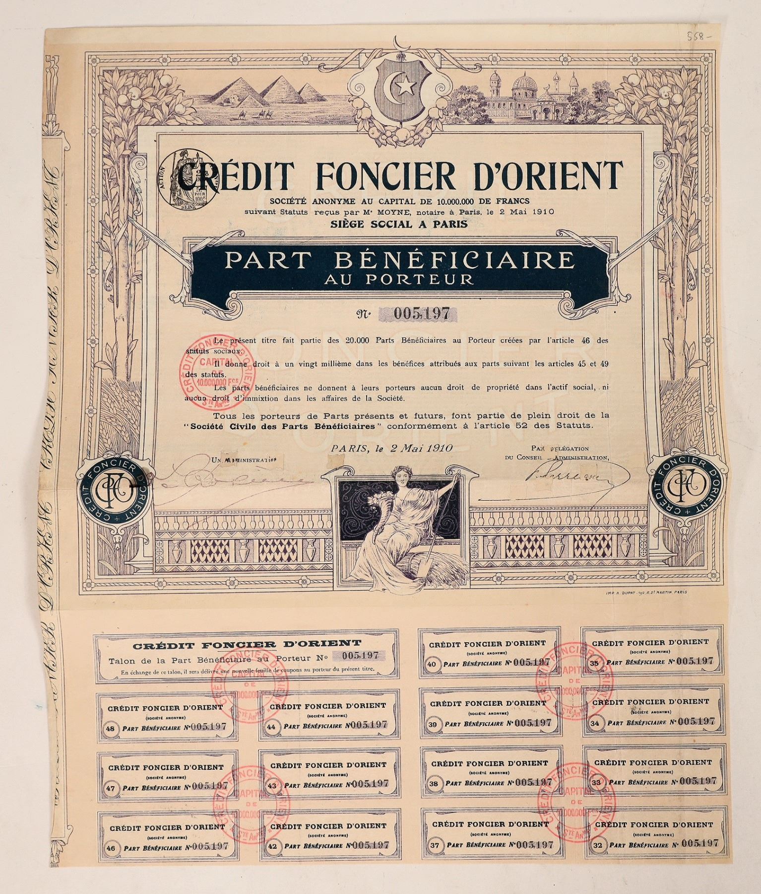 A French bond, Credit Foncier D'Orient, Paris, May 2, 1910. 10,000 Francs. No. 005197. Unique detailed vignette of pyramids, temple or mosque, moon & star. 14 coupons attached. 5 hand stamped seals or cancels. 12" x 15". Irregular cut along left side.[ Paris France