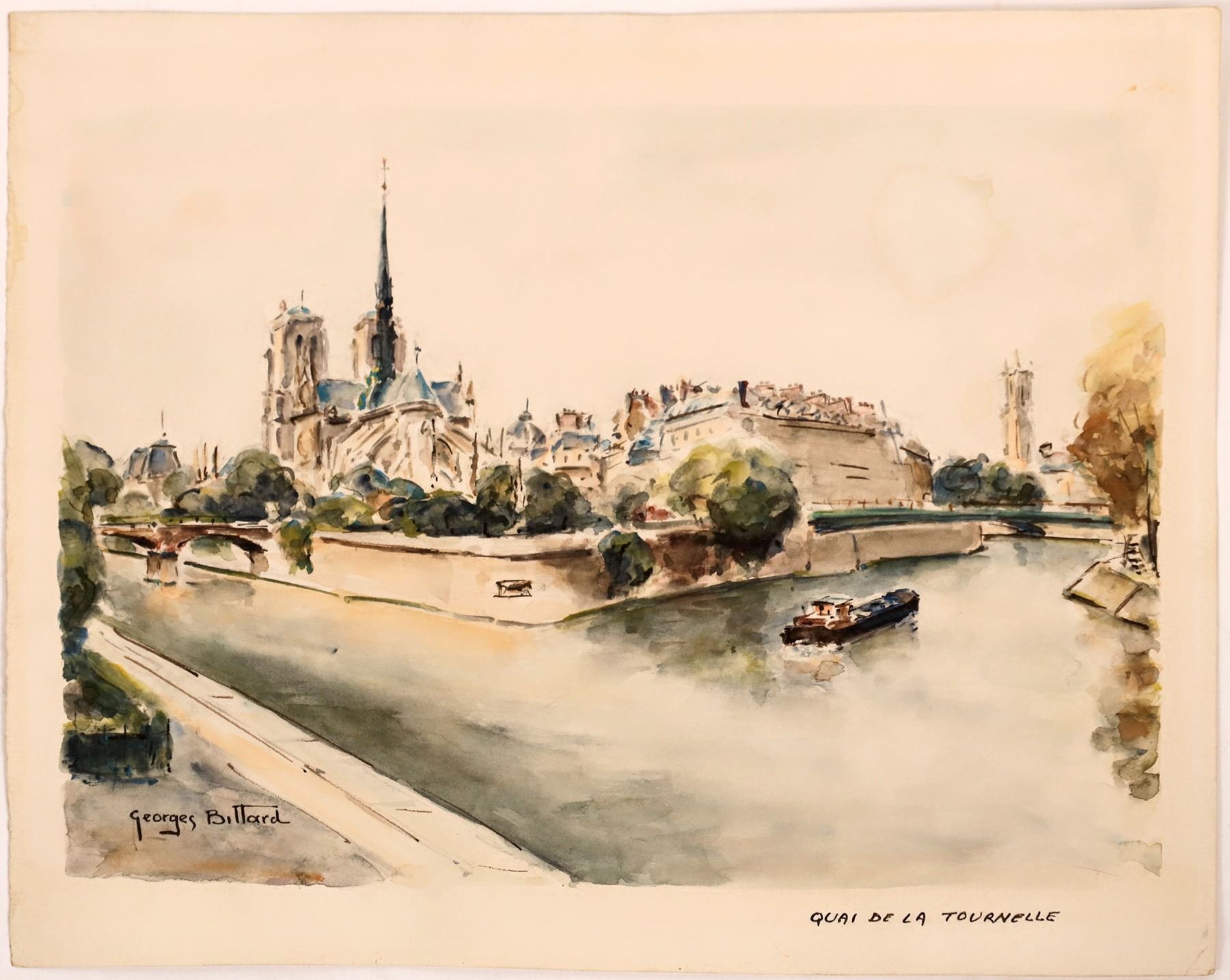 Original watercolor painting of Paris by Georges Bittard titled "Quai de la Tourelle." This watercolor depicts Notre Dame from a street across the Seine River. It is signed by the artist in the lower left corner. 11.5 x 9, good condition, some minimal water damage in the upper right corner. City: State: Date: