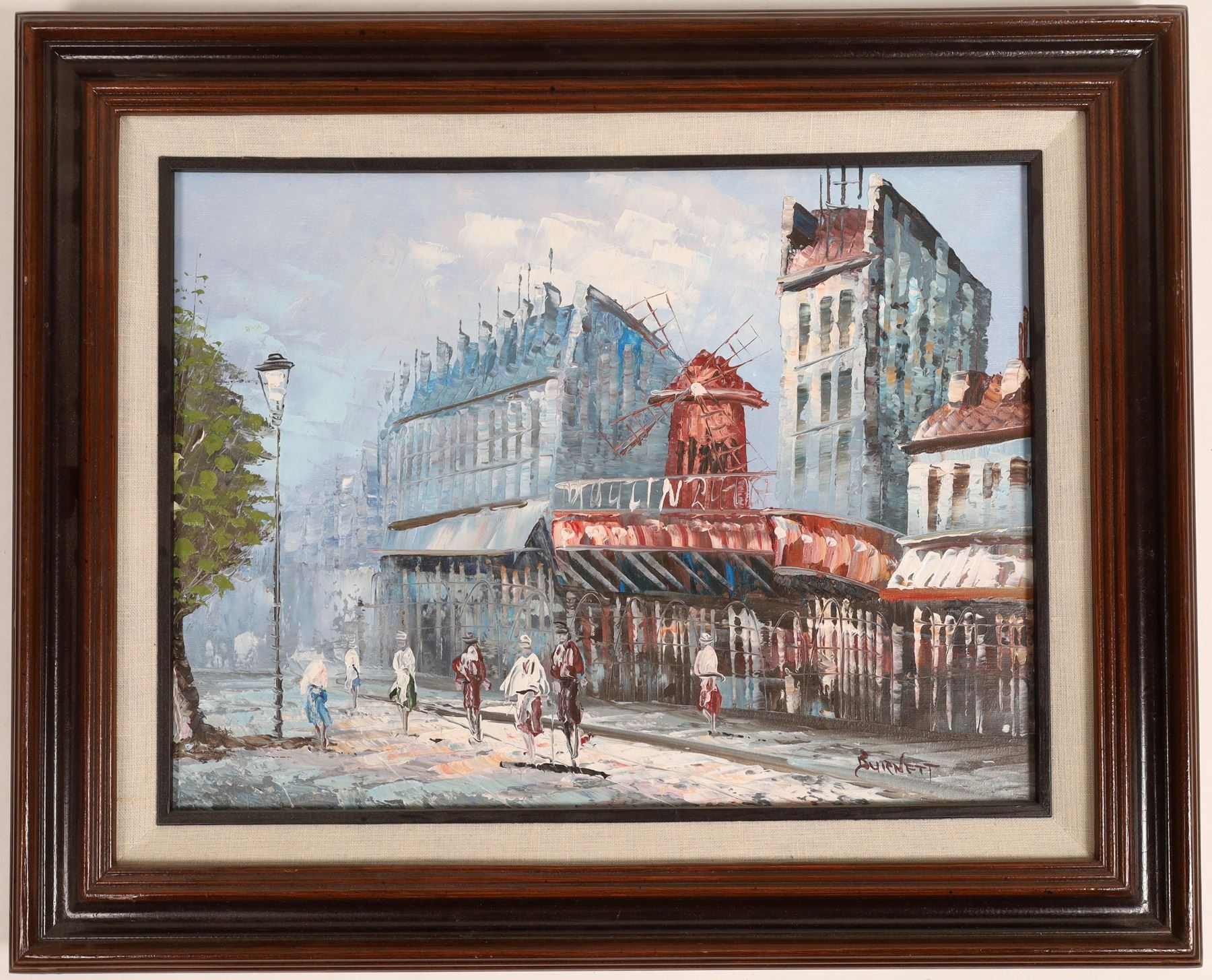 Oil on canvas painted with a palette knife. Signed in the lower right corner. 12x16 or 17 x 21 with frame. Depicts Parisian Street Scene featuring Moulin Rouge. Vivid colors with bright highlights. Nice example of expressionism, displays nicely. Heavy texture and bright colors draw attention.