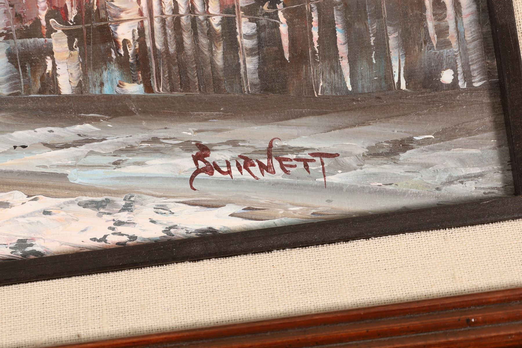 There is some question as to the authenticity and attribution of "Burnett" signed paintings widely available online often depicting Paris Street scenes and possibly mass produced. This frame suggests this piece may have been originally sold in the 1970s? This piece has not been authenticated and definitively attributed to Caroline Burnett.