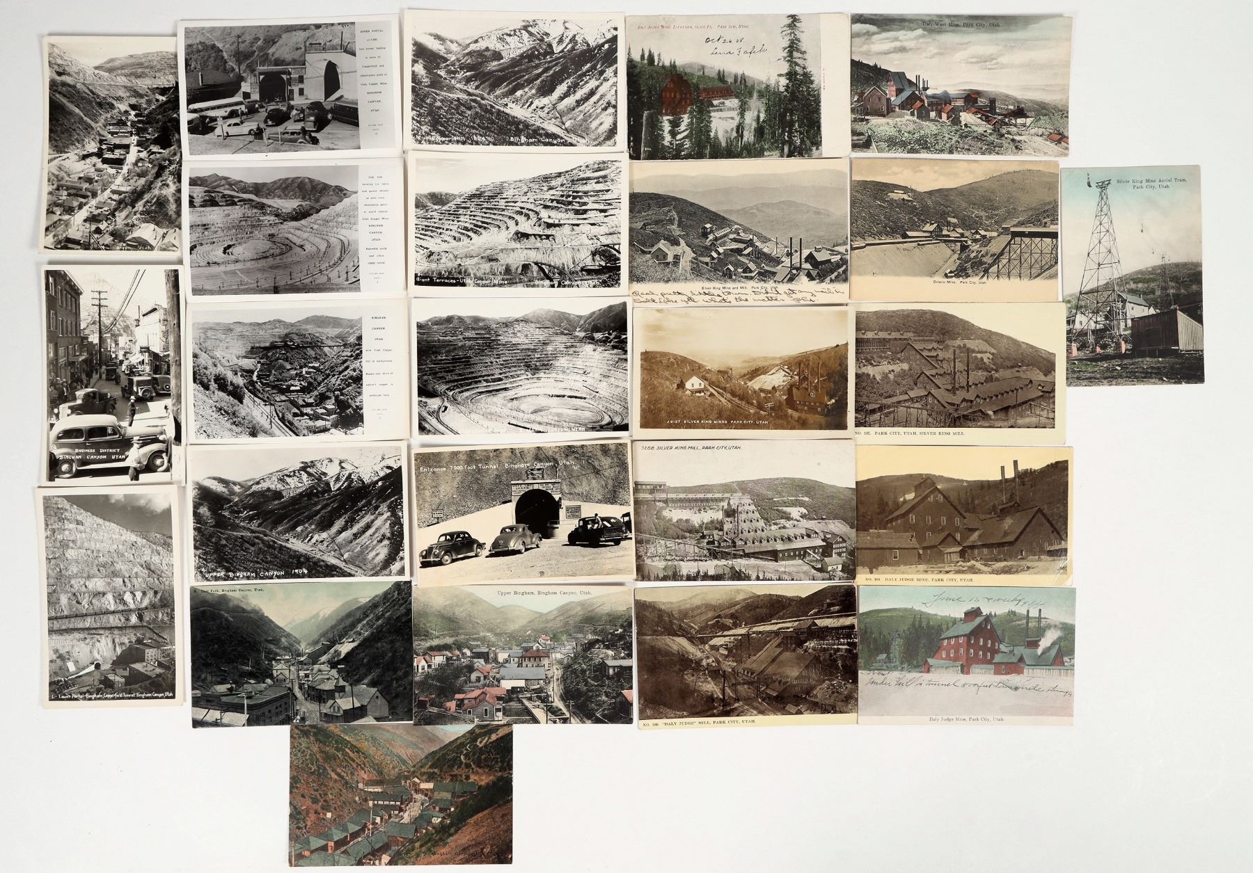 Park City & Bingham Canyon, Utah, mining related postcard group of 25, no duplicates. Park City (11): real photos (1), B/W (6), color (4). Bingham Canyon (14): real photos (11), B/W (1), color (2). Good condition, see photo. Measure 3.5x5.5".