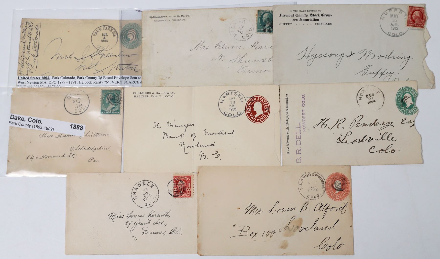 Lot of 8 different. 1) Howbert. 1892 ad cover for BR Dell of Howbert to HR Pendery in Leadville. Circular Howbert cancel, on envelope with green 2 cent stamp. 2) Hartsel. Corner ad cover for Chalmers & Galloway. 1908 Hartsel cancel on envelope with red 2 cent stamp. 3) Dake (1883-1892). 1888 cover with Dake cancel, 2 cent George Washington stamp with bullseye cancel. 4) Guffey. Corner ad cover for Fremont Stock Growers Association. 1912 Guffey cancel. 5) Webster. Chihuahua (1880-1892, now ghost town) corner ad cover with Webster cancel. 6) Park (1879-1891). Very scarce cover with Park, Park Co. 1893 cancel. Ghost town. 7) Sulphur Springs. 1902 cover sent to Loveland. 8) Shawnee/ 1906 cover sent to Denver.