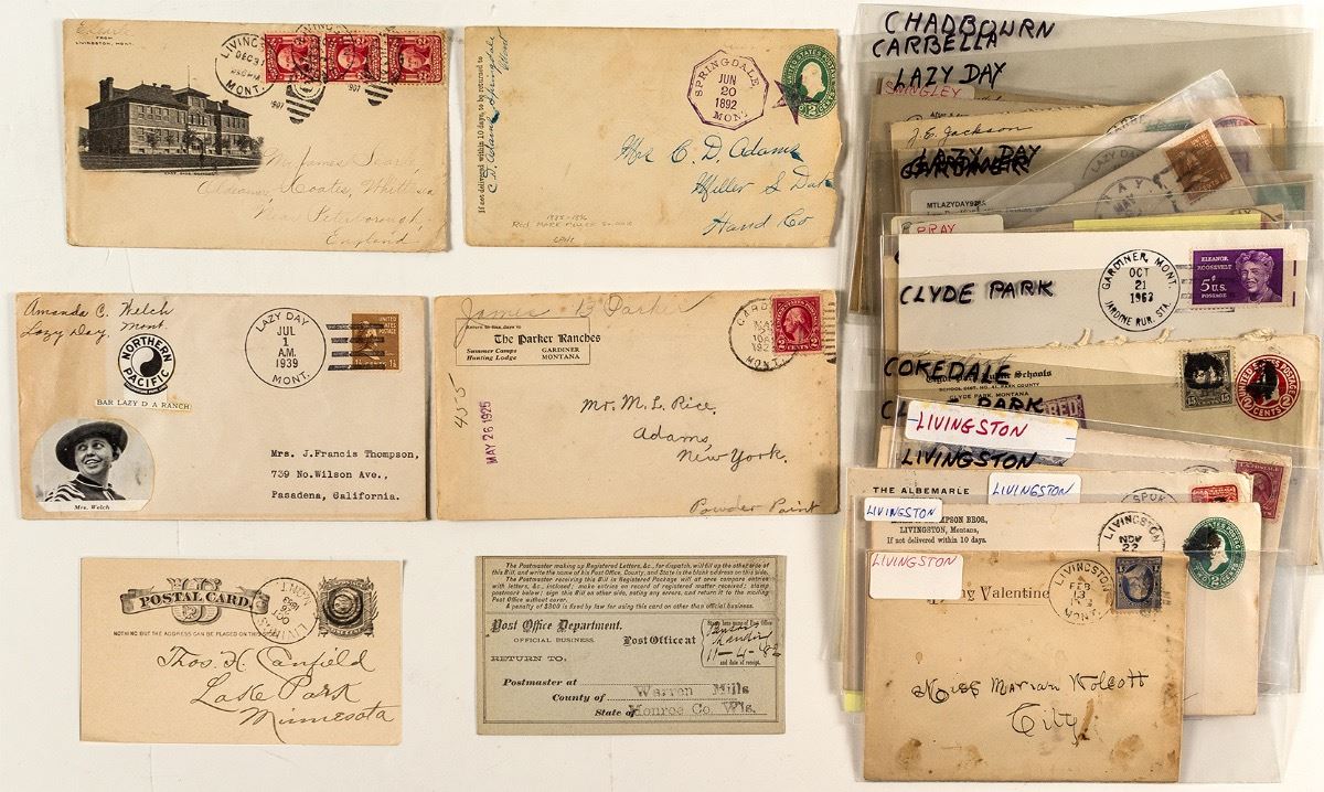 Lot of twenty-seven. 1882 Benson's Landing (1878-1882) manuscript on postal card. 1894 Coakdale (1889-1906) Livingston Coke & Coal cc with weak smudged strike. Strong 1892 Springdale octagonal with star killer. The most unique Lazy Day you will ever see with Bar Lazy D A Ranch cc. Seven Livingston with 1907 East Side School pictorial cc and 1883 territorial. Also Swingley (1921-1937), Chadbourne, Carbella, three Lazy Day, three Pray, three Gardiner with Parker Ranches cc, Jardine Rural Station, three Clyde Park with Clyde Park Public Schools cc. (Svoboda Collection) City: Park County State: Montana Date: 1882-1930's HWAC# 27977