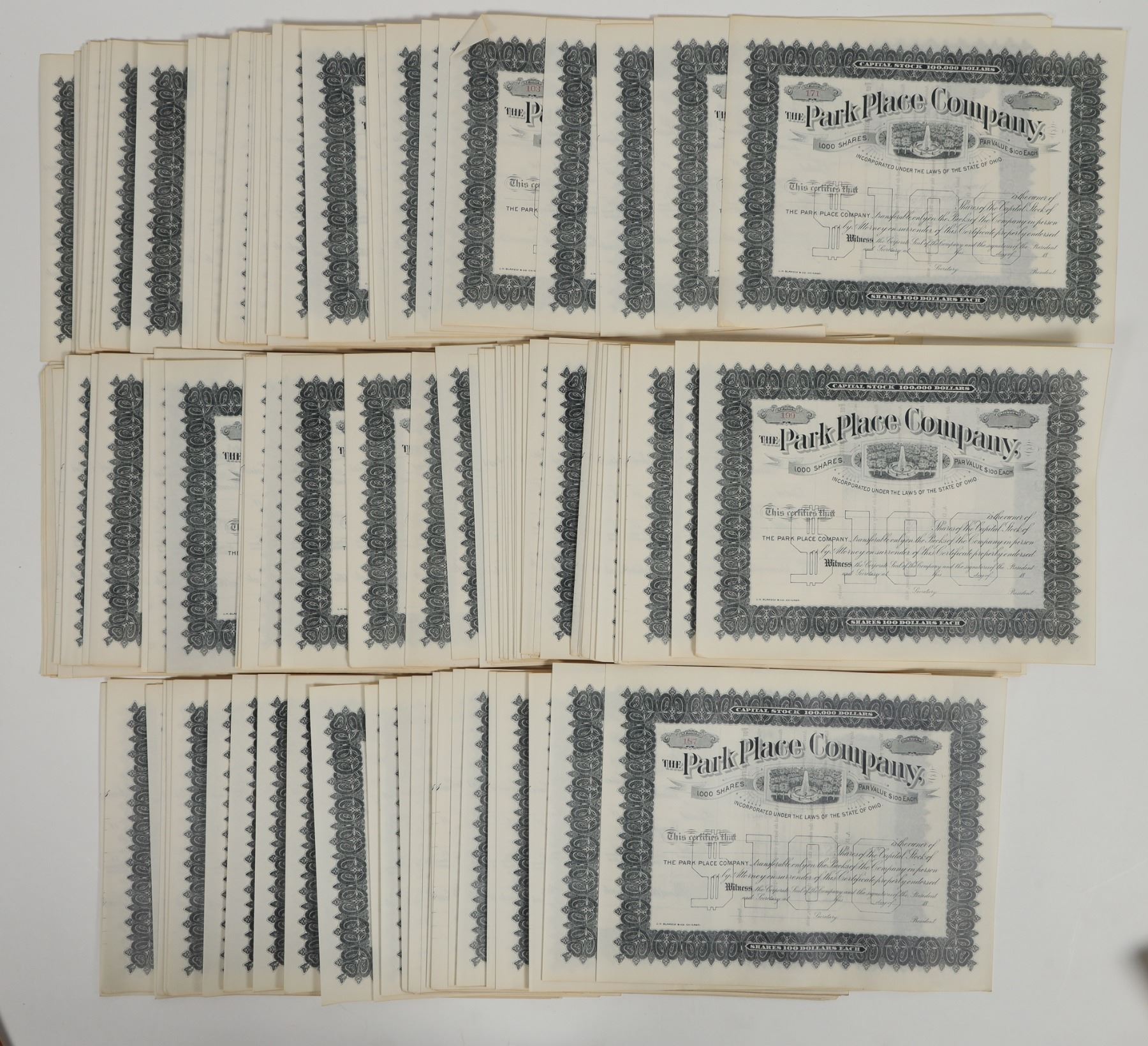 About 160 Park Place Company Stocks, unissued. Incorporated under the laws of Ohio. No information was found but may be related to the Broadway Park Place Company set up by F.W. Woolworth to finance the Woolworth Building in Manhattan, a strong possibility due to Woolworth's many corporate holdings in Ohio and because no stocks were issued for the Broadway Park Place Company as Woolworth purchased all the shares by 1914, wholly owning the historic landmark building. Another possibility is the historic hotel in Michigan but we like the Woolworth story better. See photos.