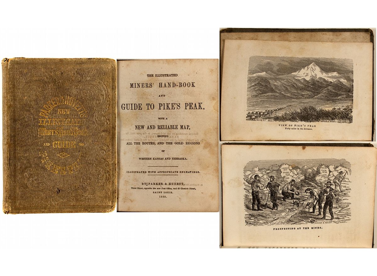 Territorial. Missing map. Parker & Huyett's New Illustrated Miner's HandBook and Guide to Pike's Peak, With a New and Reliable Map, Showing All the Routes, And the Gold Regions of Western Kansas and Nebraska. Illustrated with Appropriate Engravings. By Parker & Huyett, Saint Louis, 1859. Six engravings. Condition: wear to outer cover, soiling and toning to pages, binding tight. There is a stamp on the inner page indicating this was from Devoe & Crampton City Bookstore in Rock Island, Ill. There also appears to be pencil calculations in the section talking about the cost of mining--someone who was trying to decide if the miner's life was worth it? Ends with a series of advertisements for businesses in Missouri, Iowa, and Kansas. 75 pages before ads. Information regarding routes, history, climate, etc. Fascinating early guide. Measures approx. 4 1/2" x 6" Rarity: [i]City: Pike's PeakCounty: El PasoState: CODate: 1859