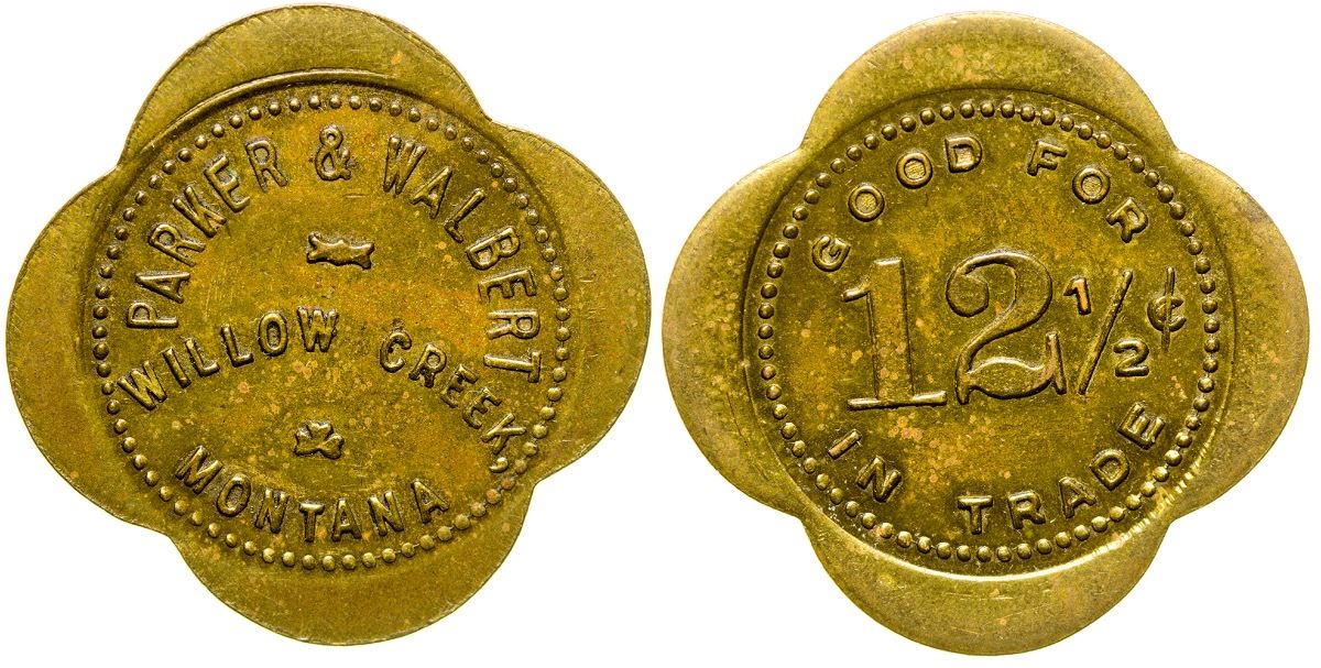 R-8. Parker & Walbert / Willow Creek / Montana // GF / 12 1/2c / IT. Brass, scalloped (4) 30mm. (Svoboda Collection) City: Willow Creek State: Montana Date: HWAC# 35030