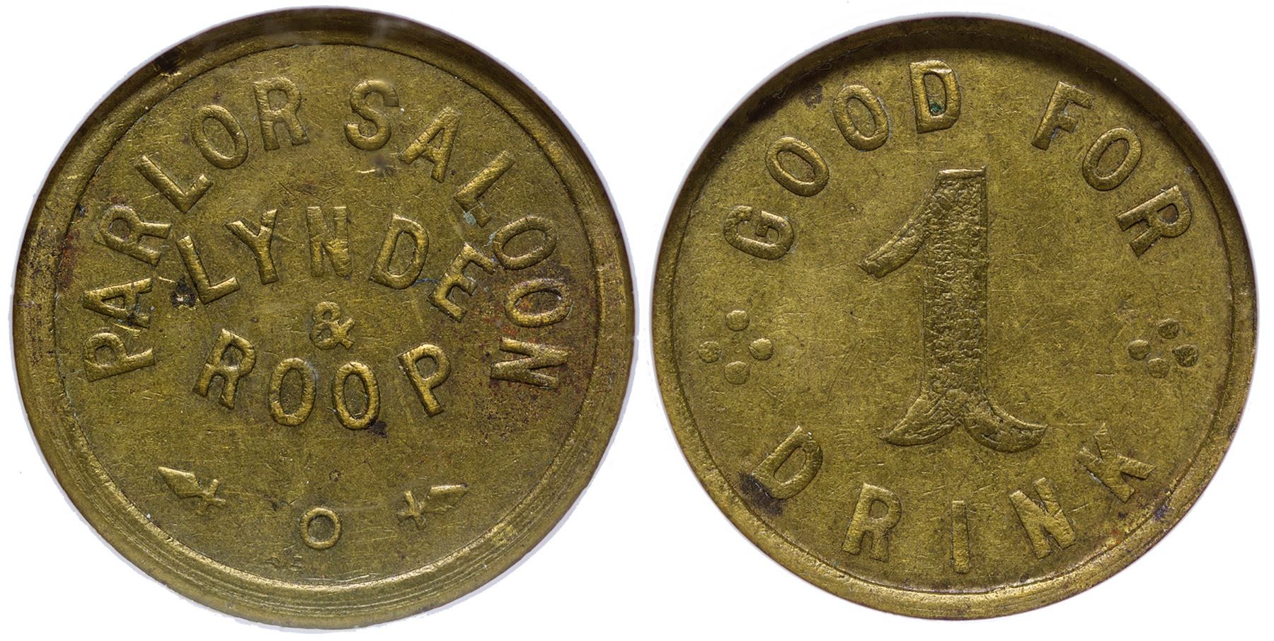 Obv.: Parlor Saloon / Lynde / & / Roop; rev.: Good For / 1 / Drink. Rd., Br., 20mm, NGC AU 58. State: California City: San Jose Date: ID# 44560